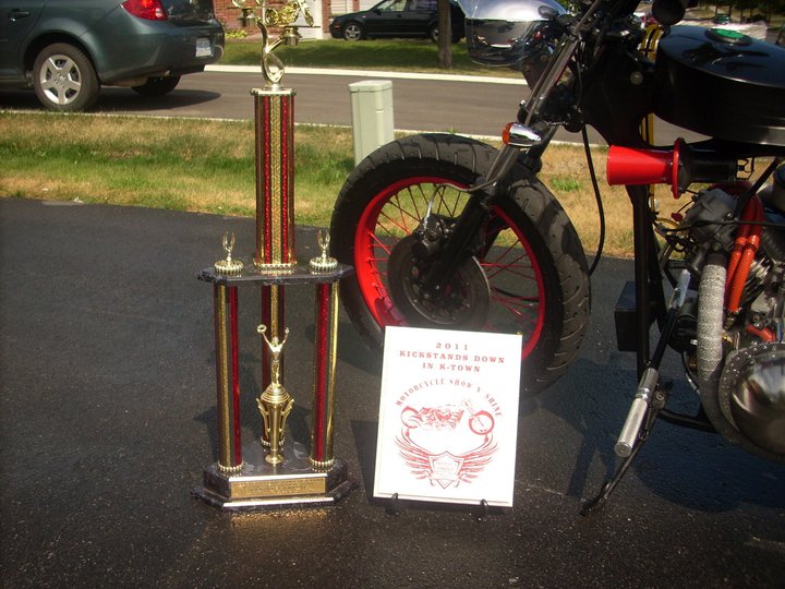 I put my bike in the Show and Shine at the Kickstands Down in Ktown bike week here in Kingston Ontario. This is its first show and it won the top prize "Peoples Choice Best in Show" The guy with theOCC custon looked pissed when my heap beat him. Just goes to show money can't buy everthing. I gave the key for the bike to the Publisher of Riders Quest magazine he had it out for half an hour and will be down in the fall to do a full article about the bike and the kids.