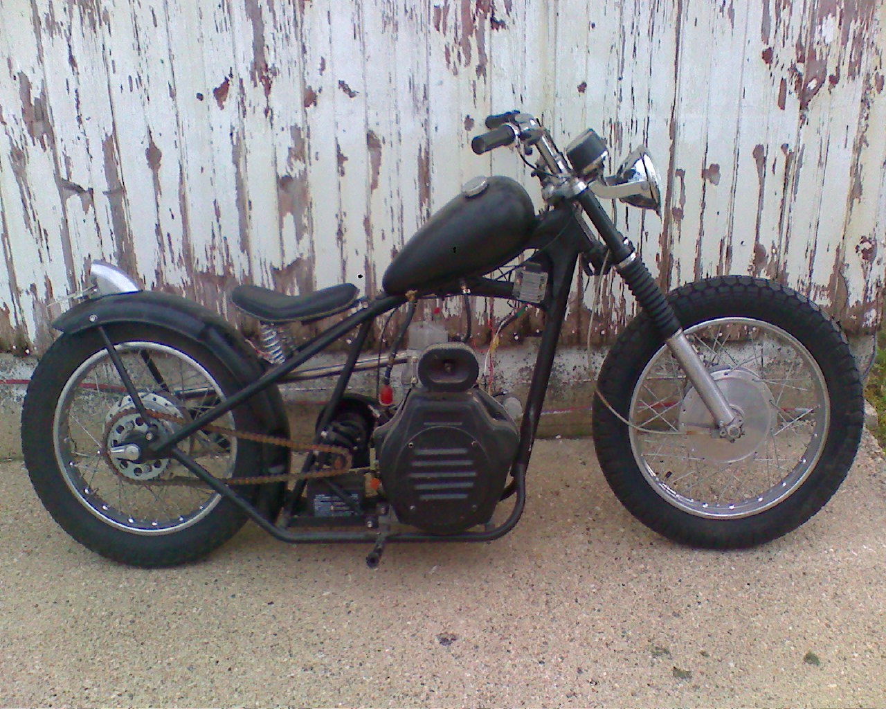 Looks like a light weight ride, when those clone engines are broken in, they rev right up...with that straight pipe, your ears will bleed from the noise :twisted: You have a piece of sheet metal missing from the front right cylinder that wraps around the cylinder to the pto side. While driving out on open roads, that's not an issue, but in stop and go traffic, you might get a hot spot on the cylinder...just an observation. It you look at other horizontal shaft gas engines, they all utilize the same sort of sheet metal. Have you gotten it out on the road? What else does the bike need to be street worthy?