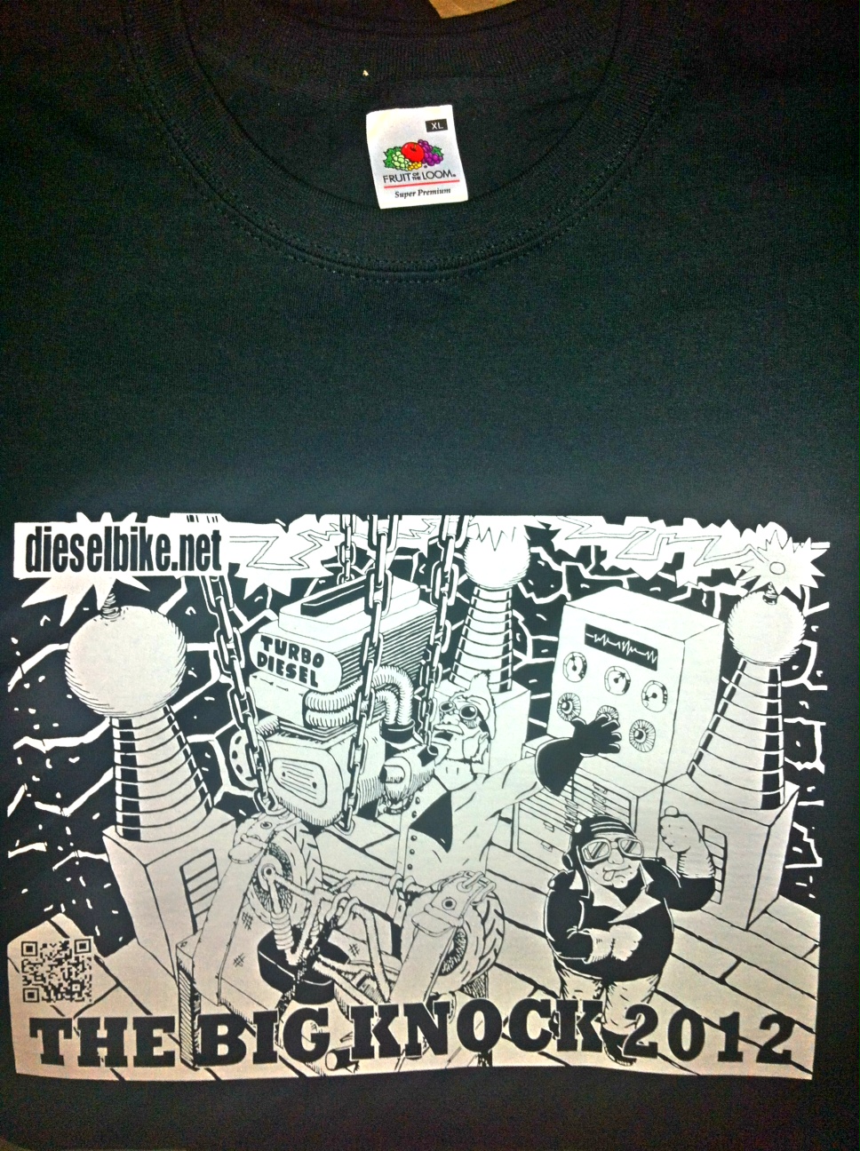 Here's a sneak preview of this years T shirt. Fun theme this year :D :D and only 50 shirts! I can't supply more just yet because of quanity/cost issues but, if it's anything like last year, there will be a few left over. I can supply artwork after the rally if none are remaining. Our artist on this was Owain Bugler and he's available to do other drawings should you wish to throw some money his way. He's very reasonable as far as costs go! DM me for his email. He can supply image in EPS Vector format as used by printers but I only have a .PDF of this. I'll also add that the QR scanner image is a first for any rally shirt we've done and yes, it does scan OK with Iphone and Android taking folks straight to www.Dieselbike.net