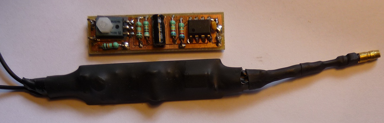 PCB lay-out is here, created with Eagle from cadsoft.de. Ground plane isnt shown: The PCB assembly looks like this, along with a version packaged in shrink flex: