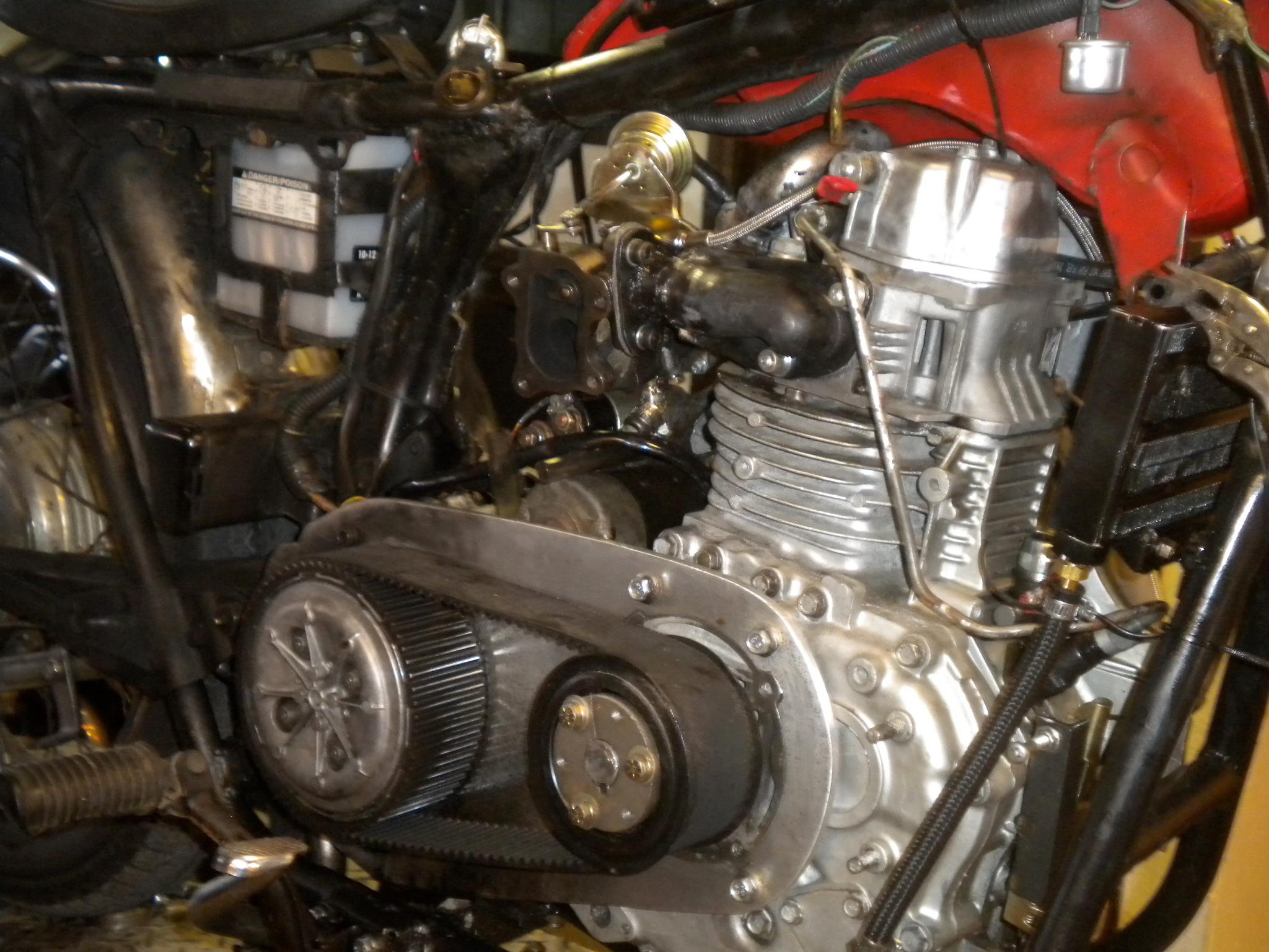 Got the bike finished yesterday. Changed rear sprocket from a 38t to a 43t gearing it down about 10%. It appears to accelerate through the gears smoothly and with more authority. It appears to generate more boost at lower rpm's with modest throttle settings and modest speeds (3rd-4th gear) generating about 4 psi of boost. Full throttle high rpm gives 8-9 psi of boost. It pulls strongly through 4 gear and when I hit 5th it accelerates to 53mph and simply won't do anymore. I have backed the fuel stop all the way out and as it's struggling to maintain 50 or so mph it's leaving clouds of fuel smoke. It is almost as if it is running up against the governor.