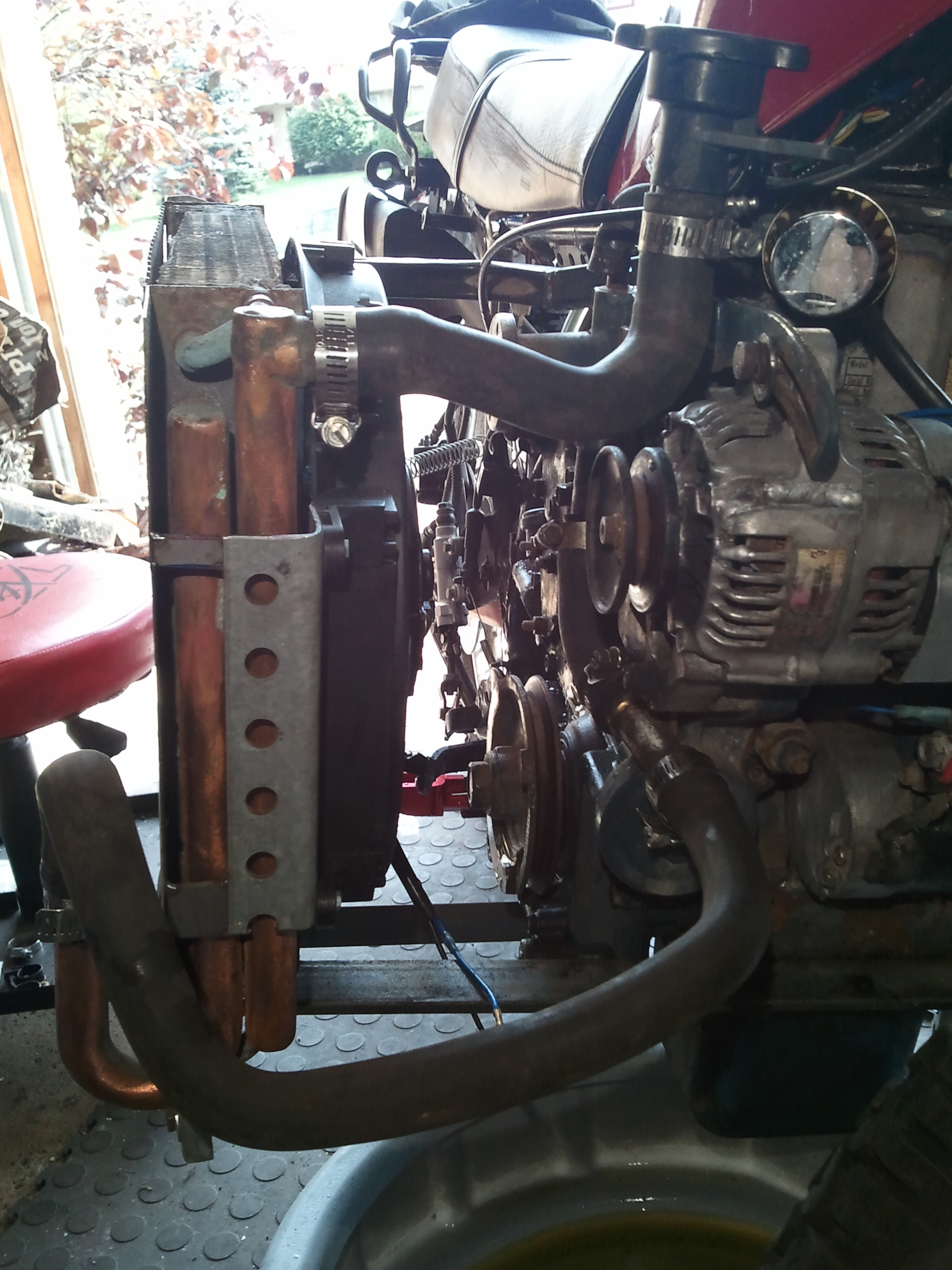 Hello all, I have been on this site for many, many hours gaining inspiration for my first diesel motorcycle build. It is a 200cc enduro now powered by a Kubota Z482 from a Carrier APU unit. I will most certainly post info and photos of the entire build process but first I hope that you all might assist me with 2 problems, overheating and the cvt. First off, my bike overheats very quickly. The top radiator hose nearest the thermostat housing reaches 240 F while the lower hose remains at ambient temperature. I have forced water both directions through the radiator and the engine at thermostat housing/water pump mounting cavity: Neither are clogged. As far as the water pump itself, I am only aware of 3 failure modes: 1. leaking weephole. 2. bad bearings. 3. impeller broken from or freewheeling on belt driven shaft. I have determined none of these are the case. The Carrier APU unit this came from actually had the radiator mounted approximately 10" lower in relation to the engine that what you see I have mounted to the right side of the bike where my radiator is nearly flush to the valve cover. The top of the radiator on the APU leads directly into the lower hose coming off the water pump. The lower hose off the radiator connects to a 180 degree copper u bend and then up around and back to the top thermostat housing. This routing (which has been confirmed correct by a Carrier service manual) makes absolutely no sense to me as every radiator I have ever seen has its uppermost top hose leading directly to the thermostat that when reaches operating temperature allows the hot fluid to flow from the motor downwards through the cooling passages and back up to the pump to complete the circuit. I have routed my hoses in both configurations with the same results: severe and immediate overheating. I am using 50/50 premix coolant. The spare thermostat I have starts to open at 160 degrees F. The faulty thermostat has been cut in half and only the "shell" is being used at the moment. I would expect this shell to delay the heating of the engine until ultimately both radiator hoses and the radiator itself reach 230 F at which point I am overheating. Does the system need to be "burped"? If so, how is that done quickly? I should mention I am using a Kawasaki Ninja 250 radiator cap and hose elbow which obviously is mounted at the absolute highest point. If any of you would provide some insight into what I am missing I would appreciate it immensely!!! Thank you all, I love this website!