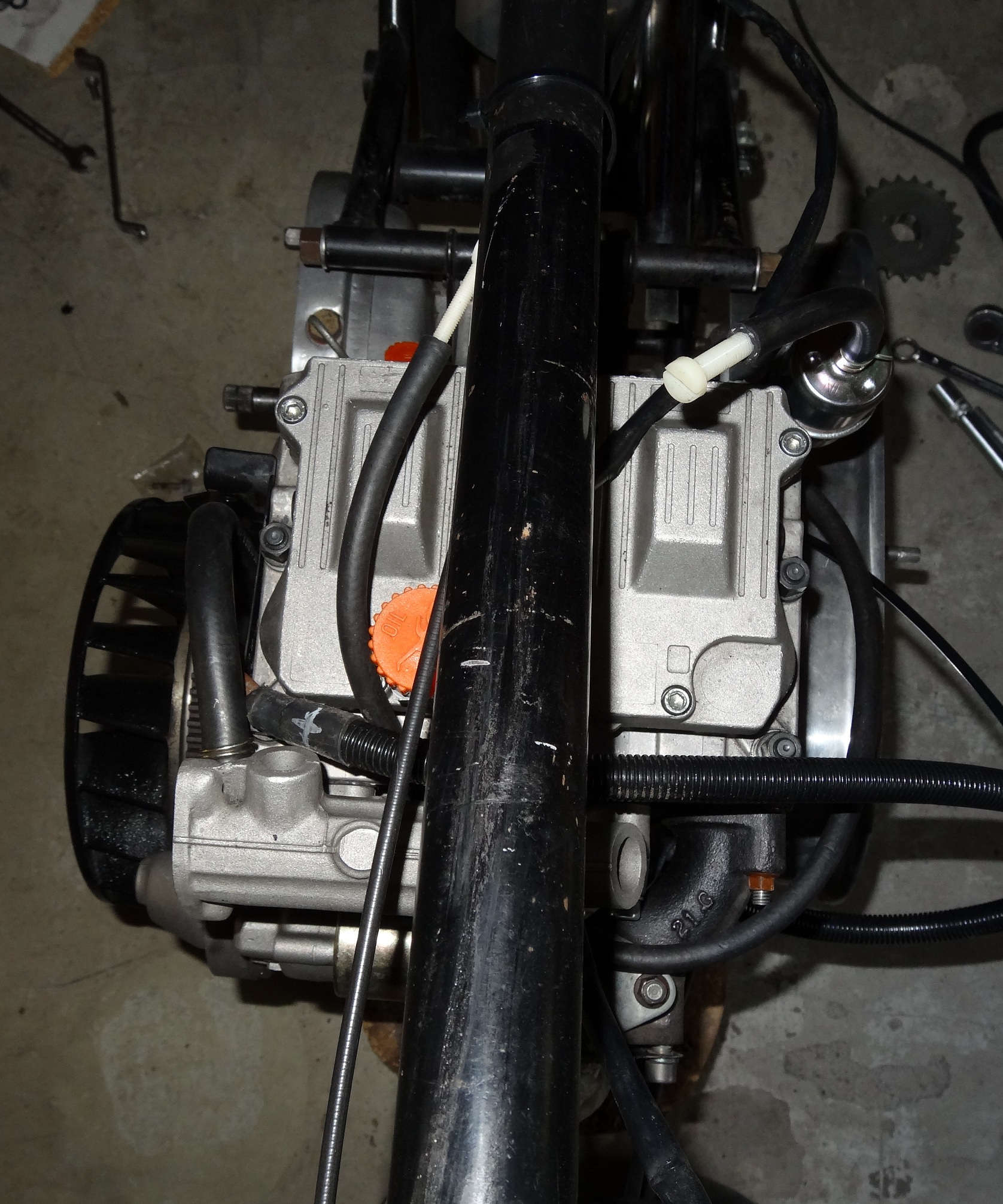 My engine is 3cm over to the left (as you sit on the bike). Measured from the gap between the cylinders and the frame back bone. Right from the start of my build I moved the engine left and right until the balance was spot on. So what have I done now? Put a dirty great Harley battery on the left hand side, Doh.