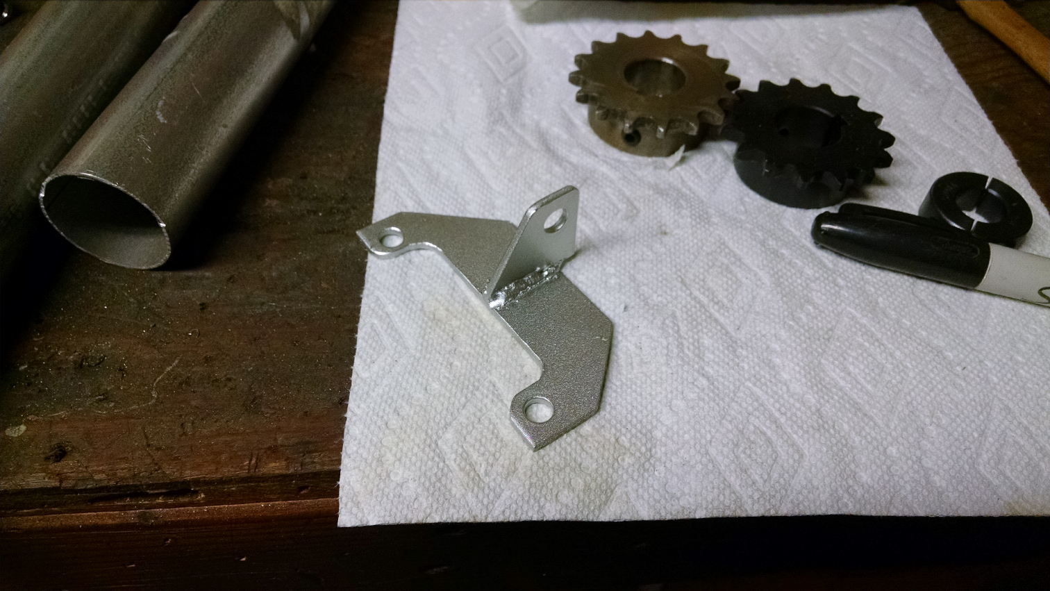 To estimate sprocket sizes, I created a spreadsheet to calculate the approximate gear ratio for the final drive, and used trial-and-error to zero in. Ultimately, I decided to go with a 54 tooth rear and a 14 tooth front as the conservative testing ratio.