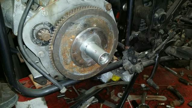 . 1" axle shaft has been milled down to fit into the center hole in the flywheel giving a true center. Primary clutch of CVT will go on this shaft.