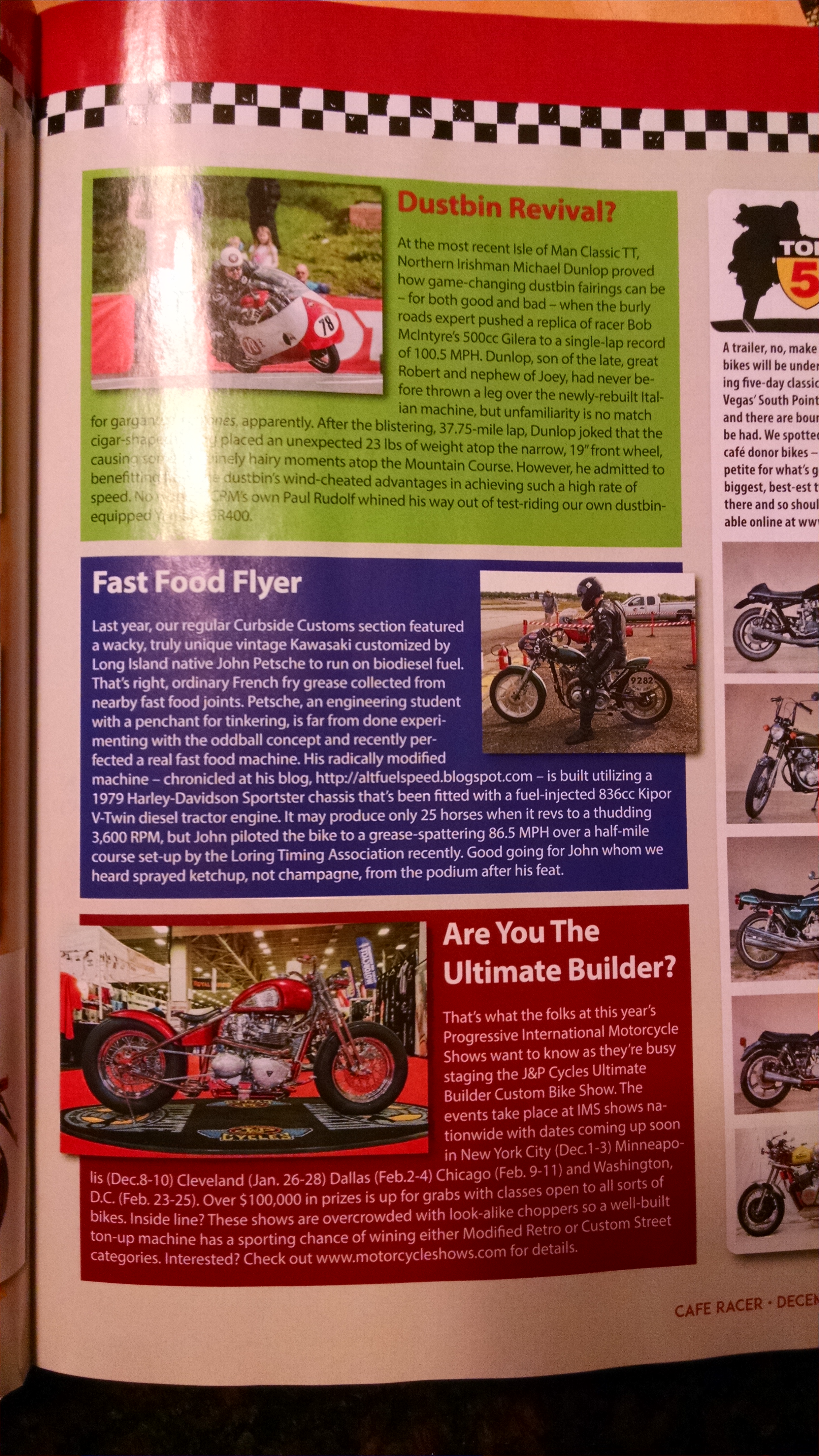 The bike was geared to 102mph at a redline of 4100 rpm, but couldn't push past 3800. The engine ran very near its limit, with intake pressure at 7psi, intake temperature at 150F, and EGT hot enough to destroy the 1000F rated high-temp coating on the exhaust!