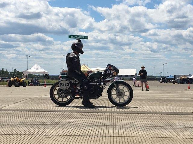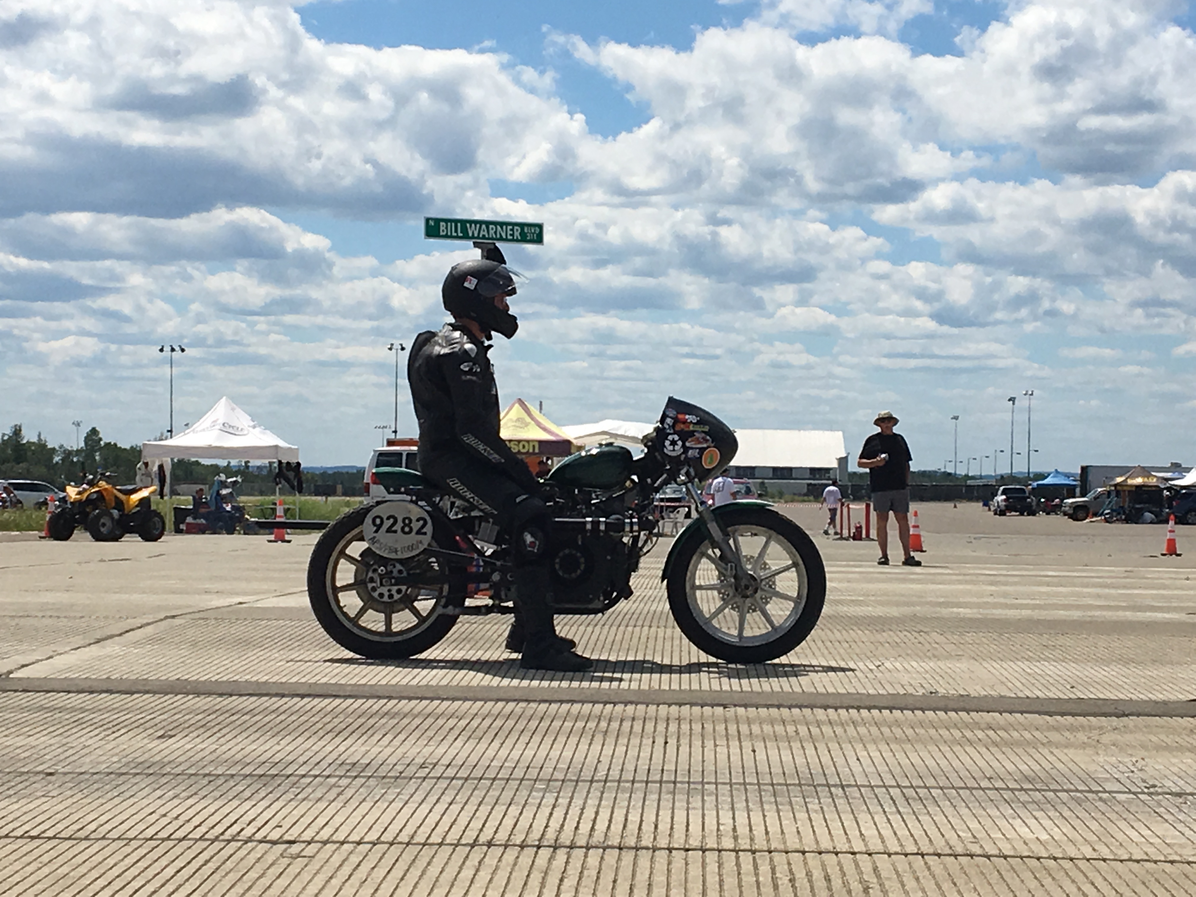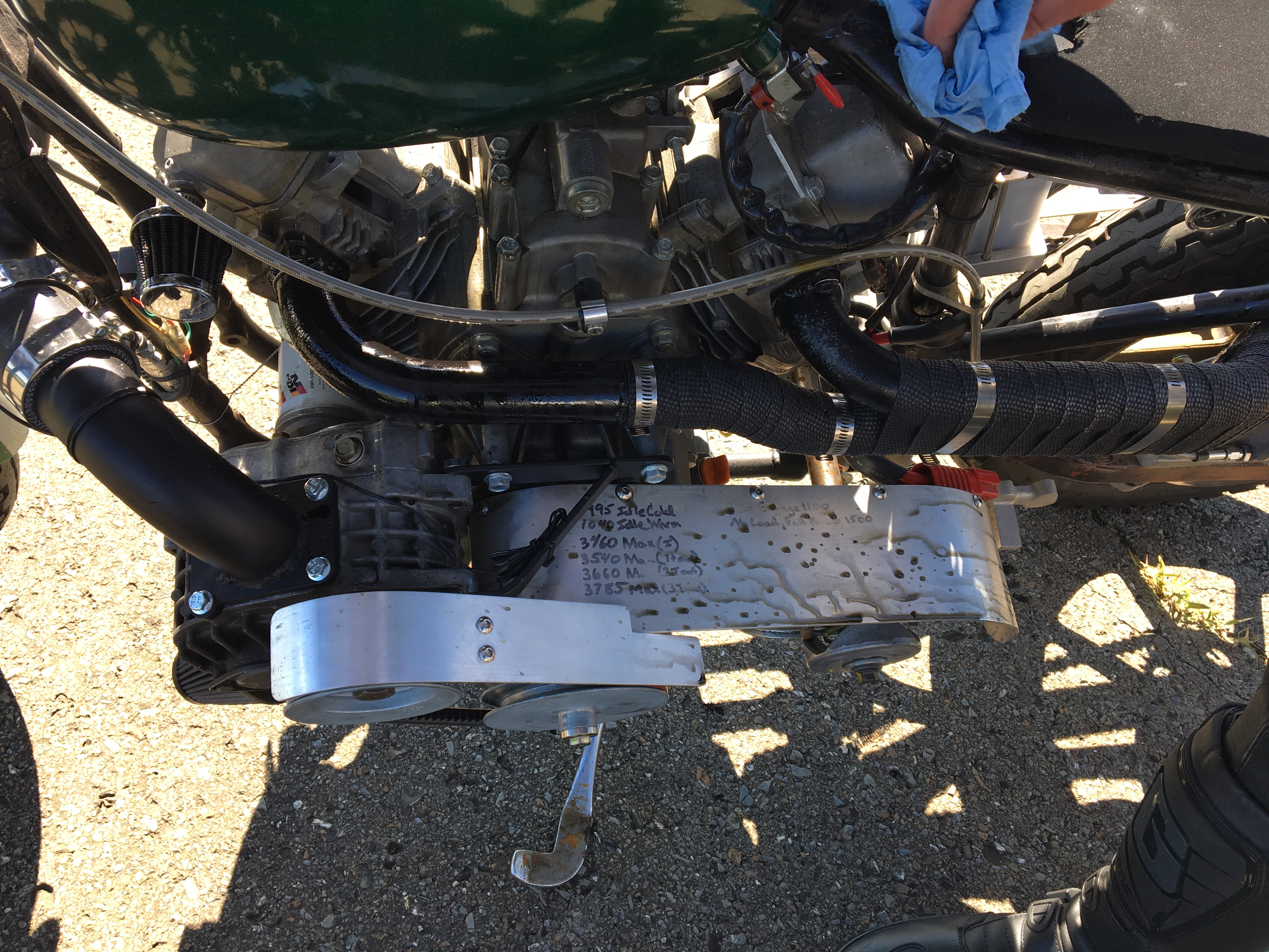 After prepping the bike, we rolled over to the staging lane and joined the queue. The first run went extremely well, and I beat the previous top speed by 7 mph. However, while riding down the return road, the engine started spitting oil out of the crankcase breather and coating the left side of the bike.