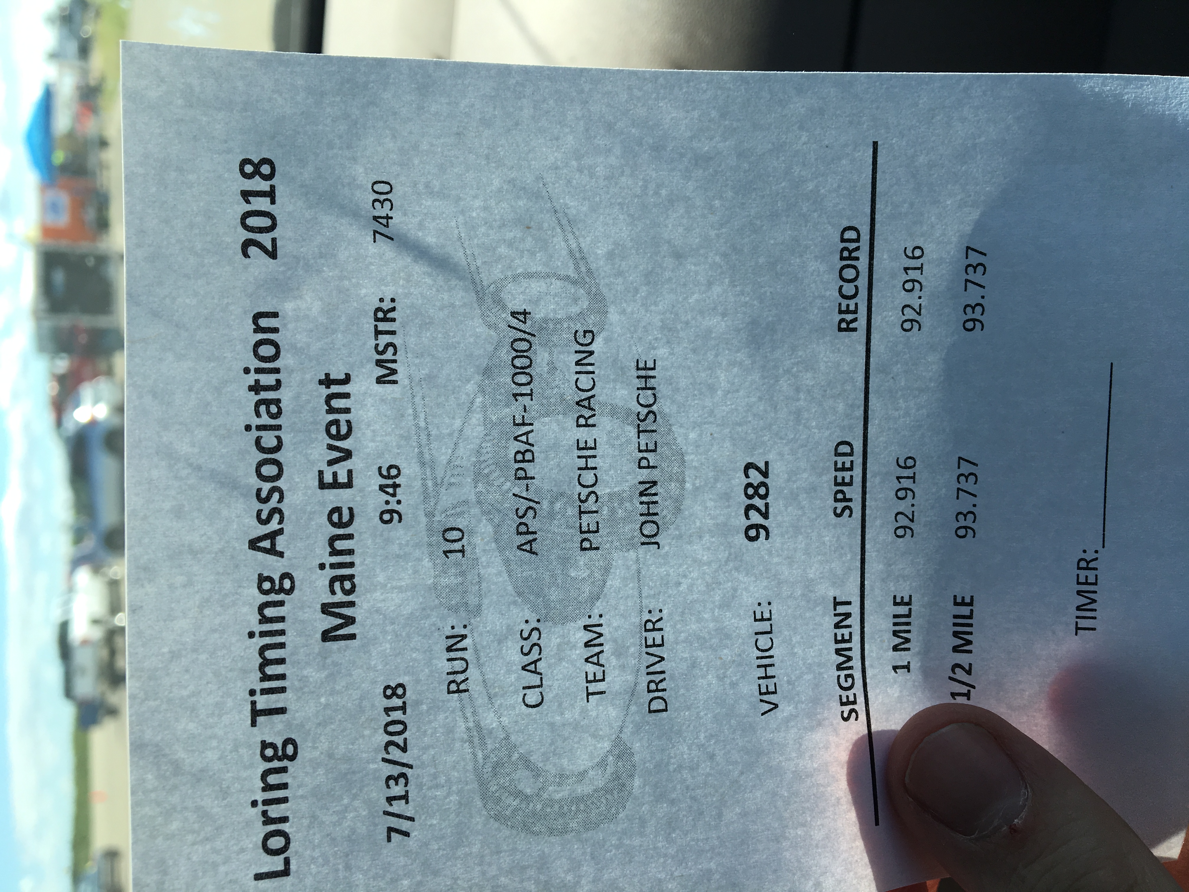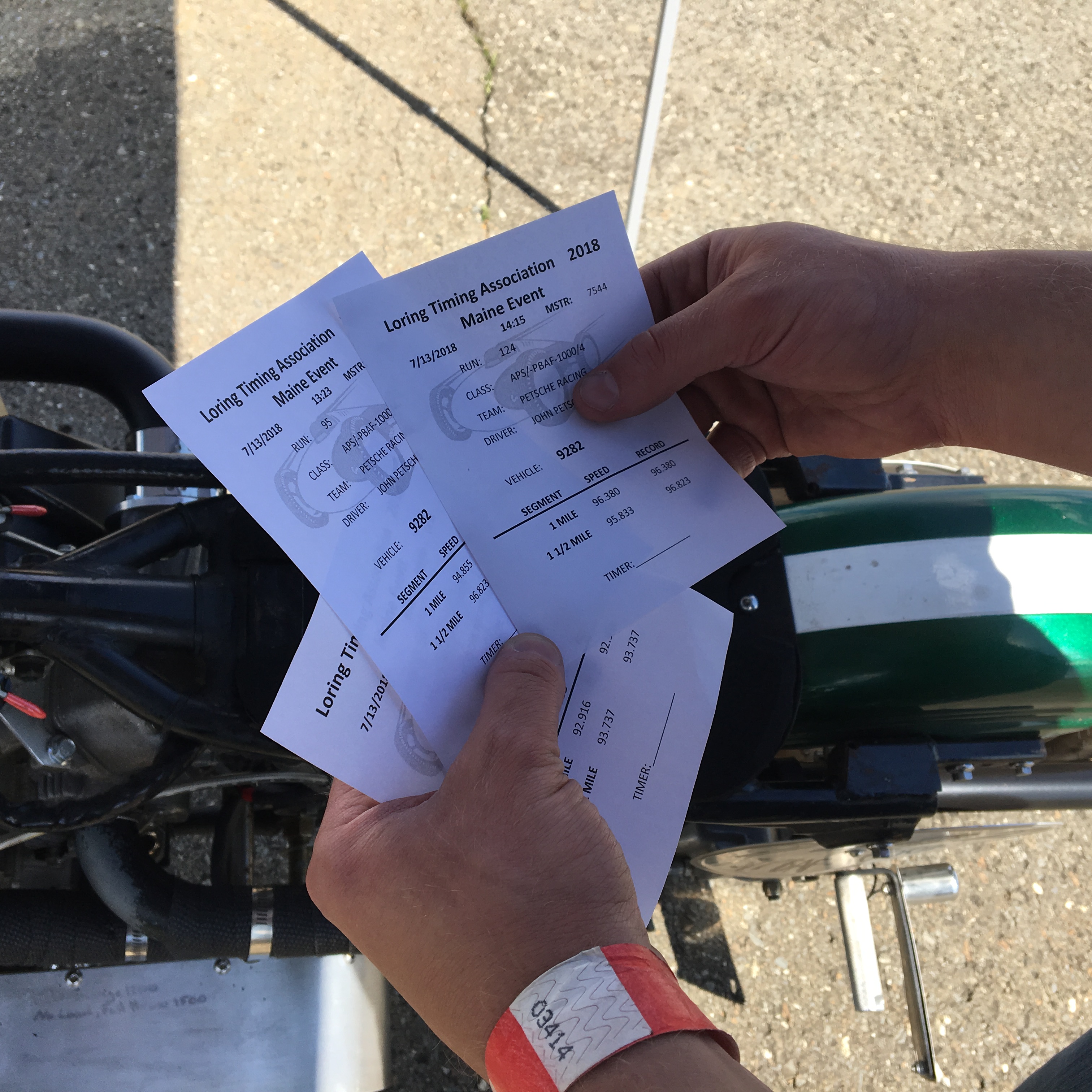 This past weekend, two of us traveled to northern Maine for the yearly pilgrimage to the Loring Timing Association in Limestone. I'm happy to report that the Sportster didn't disappoint! Weather and wind were favorable, and the bike posted a top speed of 96.8mph!