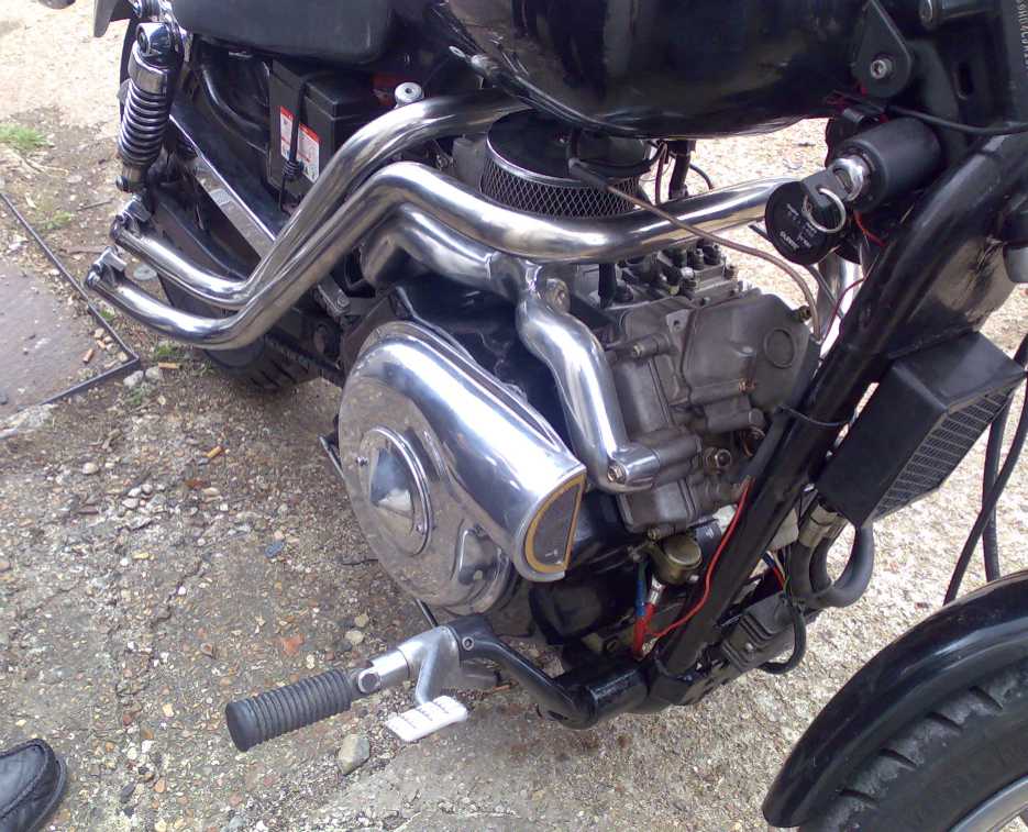 Notice his pipes have been turned out and had new flappers fitted. And an air fan was robbed of it's fan guard to create a new 'ram air' scoop for the Harley Dieselson motorcycle