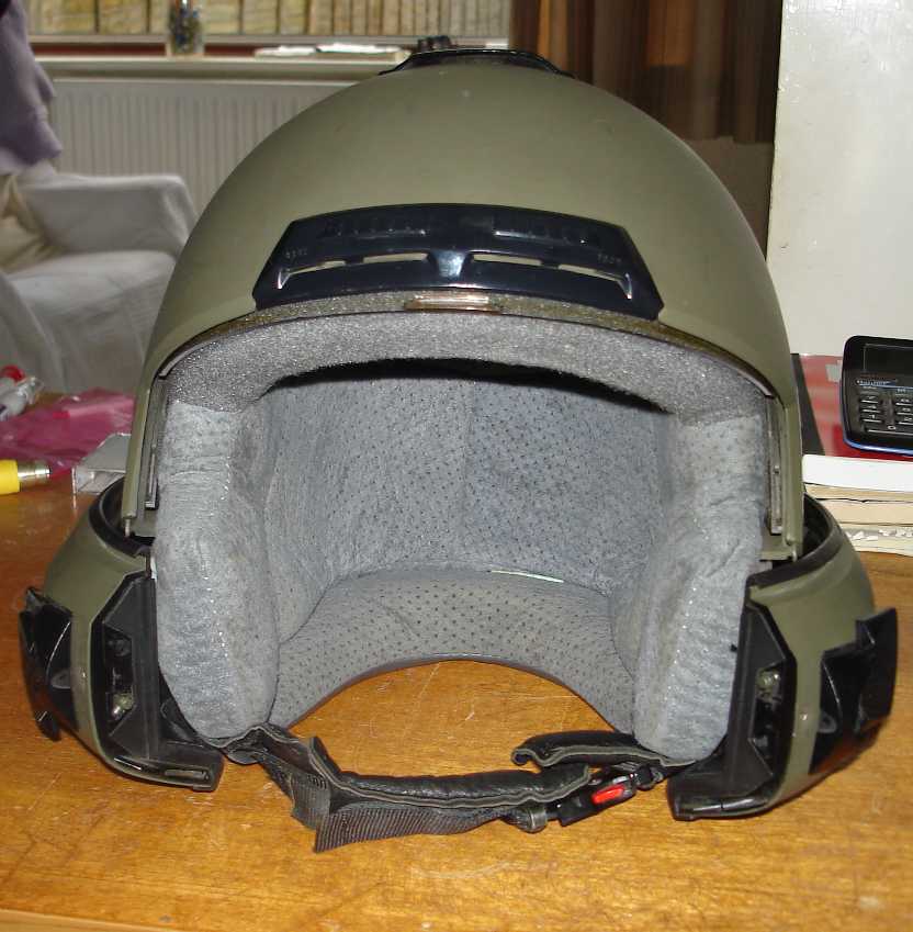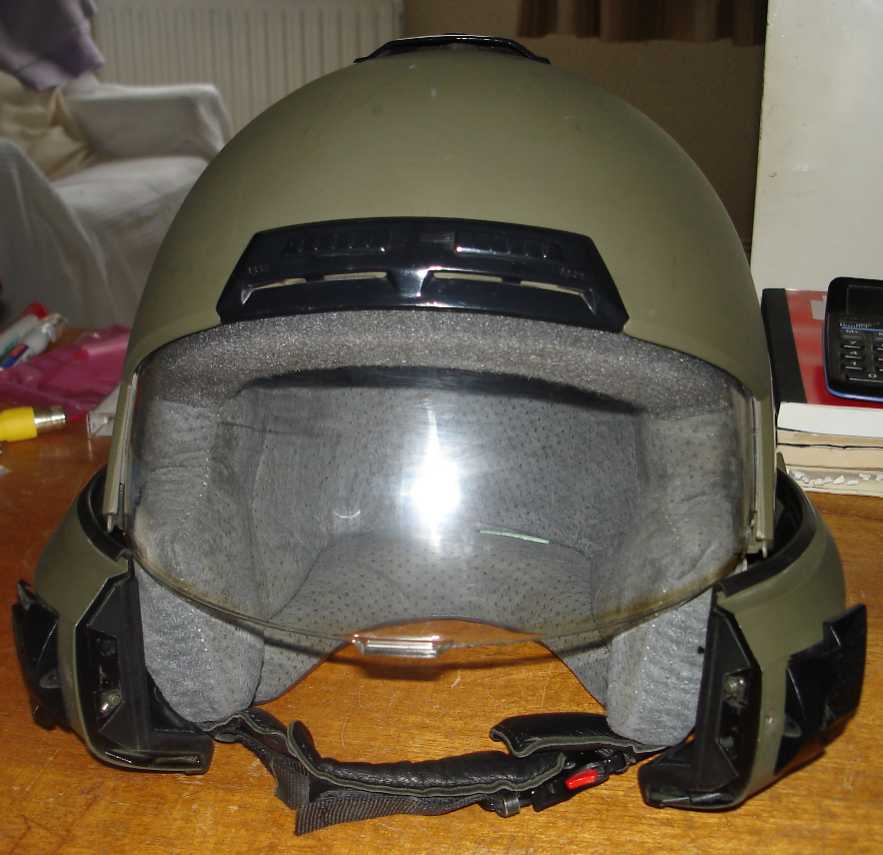 I picked up an army bike helmet in a French Surplus store the other day. Only wanted it for the colour incase I ever get my grubby mits on a KLR. I don't, as a rule, buy secondhand helmets for obvious reasons but this was in good nick and opened up very much like a fighter pilots helmet with sliding sides. Cool 8)