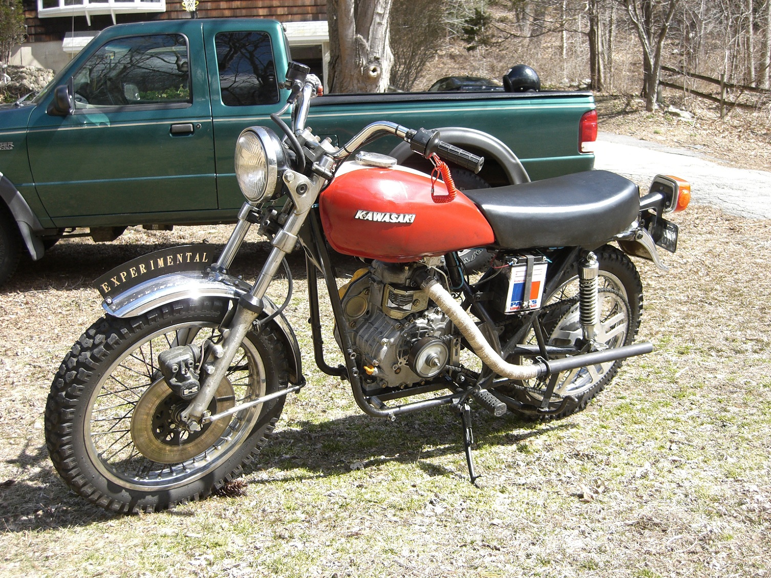 I installed street tires to cut back the rolling resistance. It is fairly difficult to find modern tires with unbroken ribs in the center of the contact surface, but I finally found a type of Metzler that worked. I used the same tire front and back, but almost ran into disaster when the tire started rubbing against the front fender! Apparently, 4.00x18 tires don't have consistent sizes; the previous knobbys were supposedly the same size and they had plenty of clearance. I had to modify some mounting hardware to make it work.
