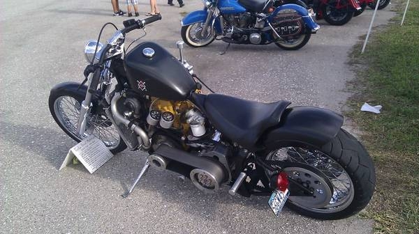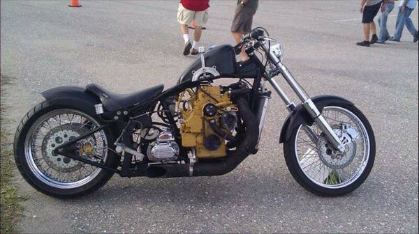 Craigslist March 2013 wrote:Caterpillar powered diesel motorcycle. Turbocharged, 3 cyl 1113cc diesel. 6 speed trans, open primary. Bunch of custom machined parts. Right side suicide shift. 120 mph @ 4200rpm. Mean, fast and fun. Will turn heads everywhere. Won plenty of shows.