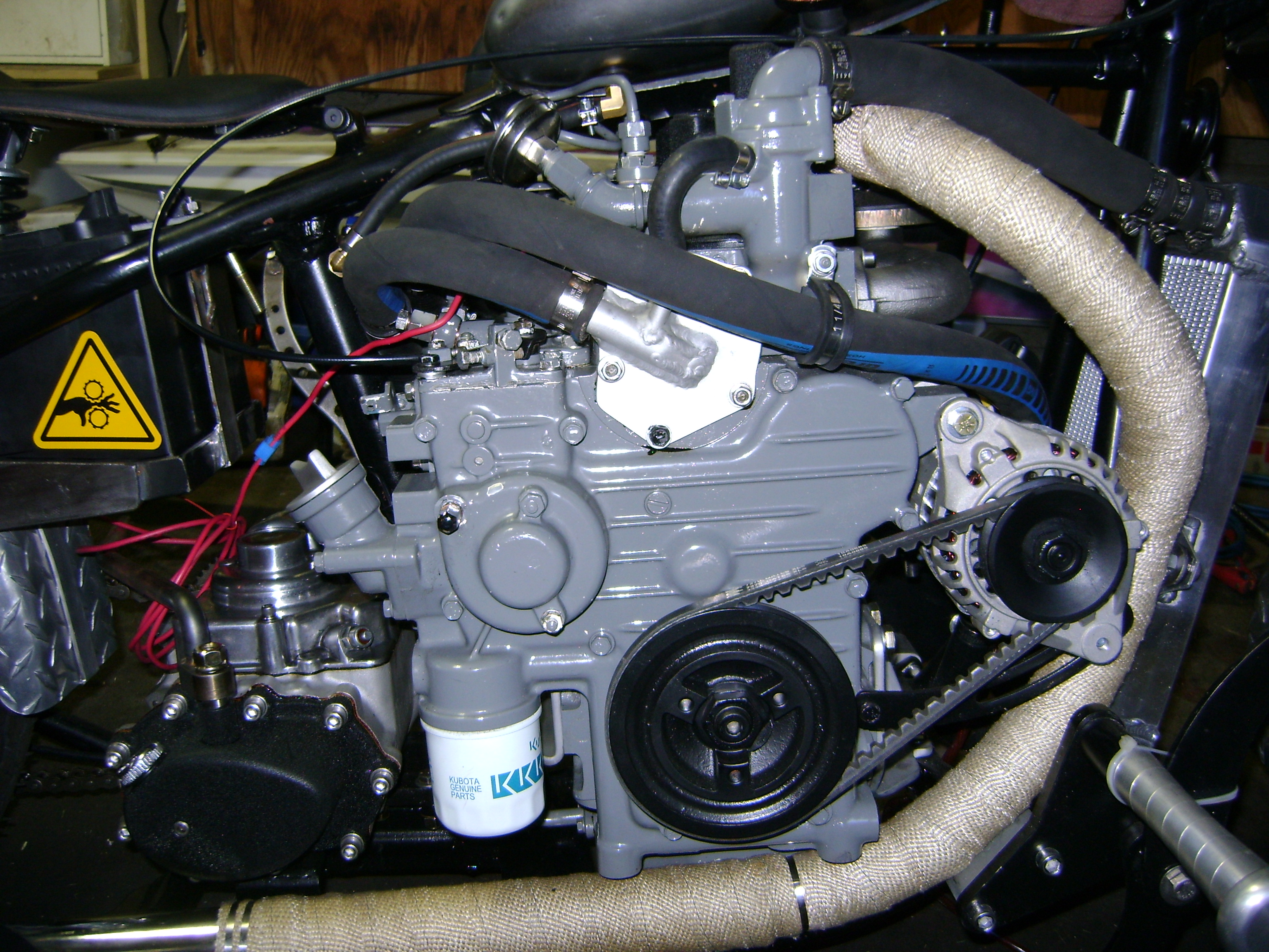 Hi, I'm located on Vancouver Island Canada, and came across this forum, and thought you people might like to see the diesel bike I built, 1961 harley frame, 4spd trans, D950 3 cyl. Kubota. I'll post a couple pics, if there's interest I'll post some more, I'm open to questions as well, Hope I can contribute to the forum and also learn.
