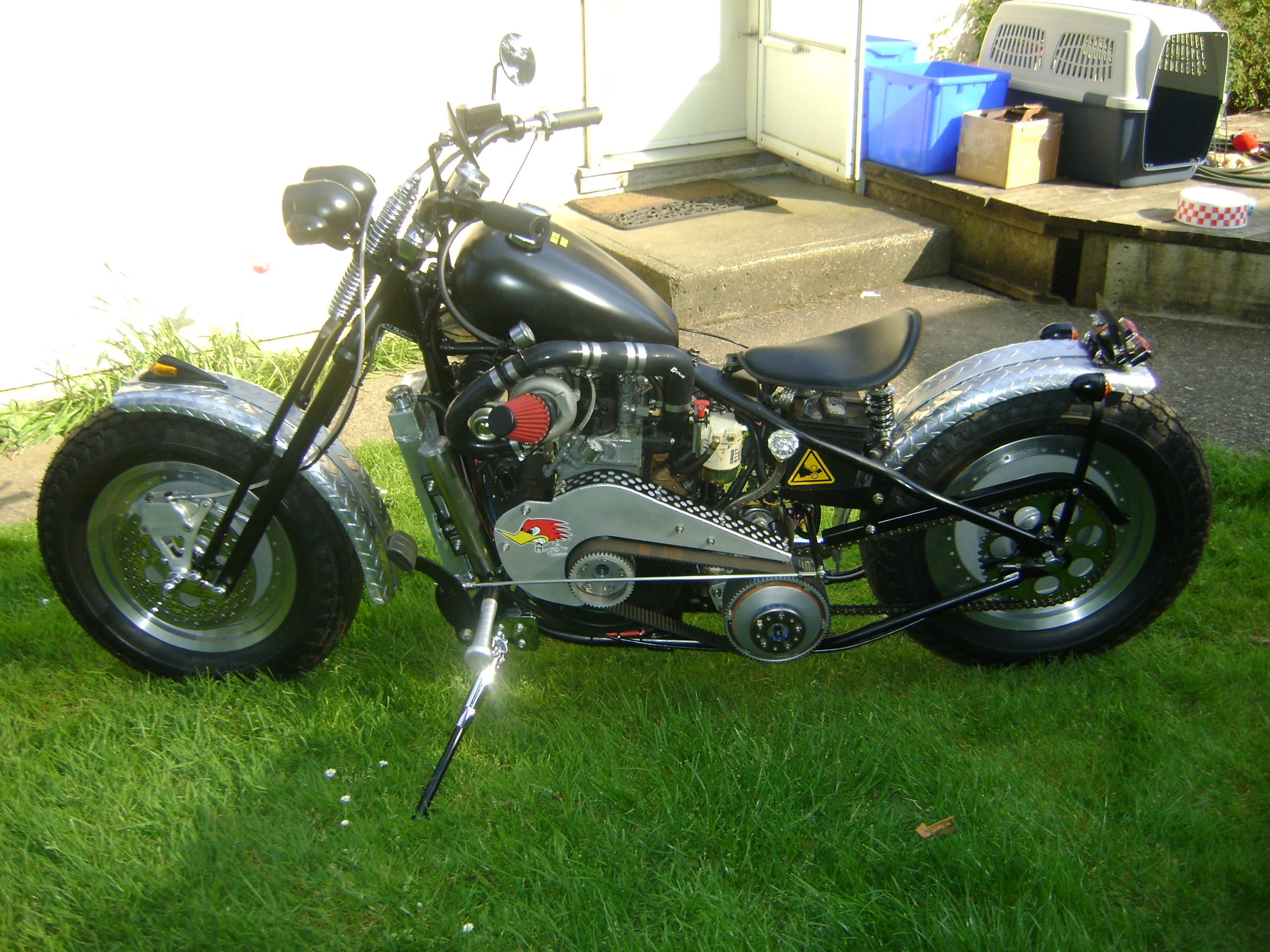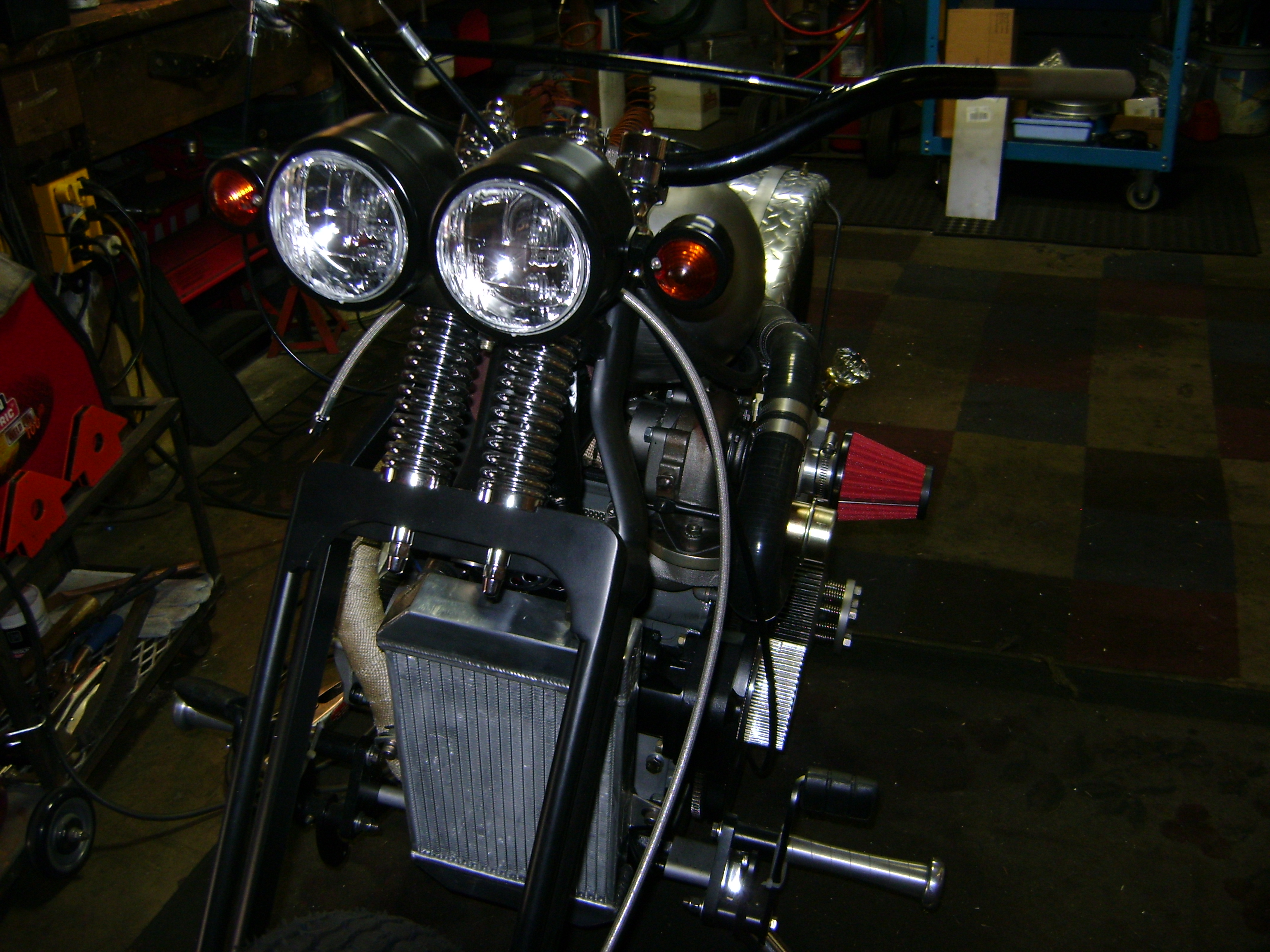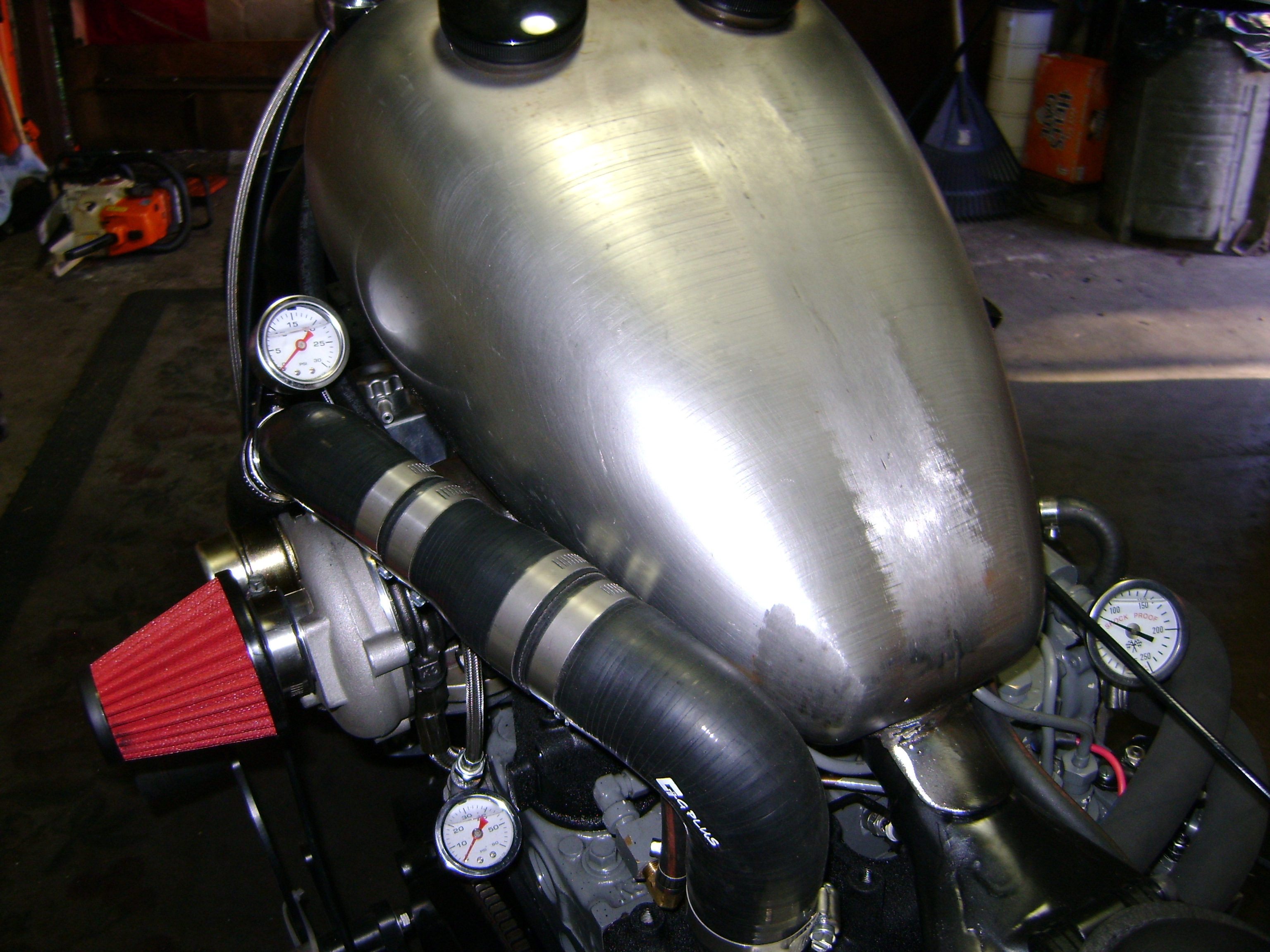 Thanks, I'll be sure to throw up a build thread, just have to get thru Xmas, then I'll have some time to put it up here. The transmission is a 4spd Harley trans, while I was building it was easier to make the shifter pedal a clutch pedal with linkage to a clutch release arm from the trans, and bolt on a custom made hand shifter handle, and yes the hose up to the tank is a fuel return line. The build was a fairly easy build, I didn't have to cut, or modify the frame, well not entirely true, I had to cut off the top engine mount tab on the frame to clear the valve cover, could be welded back on. I haven't ridden it yet, I was so close, I got a used clutch drum and engine pulley for the open belt drive, and I went cheap and got a "good used one" on flea- bay, totally worn out junk, so I bit the bullet and got a new set, just finishing up the install now, doing wiring right now too. These x mas holidays I hope to finish up the wiring and finish the belt drive and ride it. p.s. the turbo is a GT15 from flea- bay, can't wait to hear it spool up, under load.