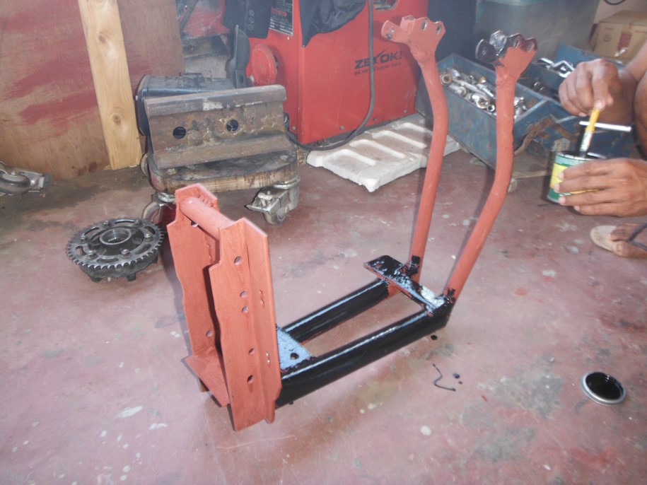 It took a lot longer than 8 Days, but day before yesterday my belt drive finalaly came. And I started. I will use a spare frame for fitting. The jack shaft is in and the engine is hanging in the correct position. I had to cut of something of the trottel arangment to get the 208 mm center to center. I cant get a longer belt here. Now I have to make a lower frame to mount the engine.