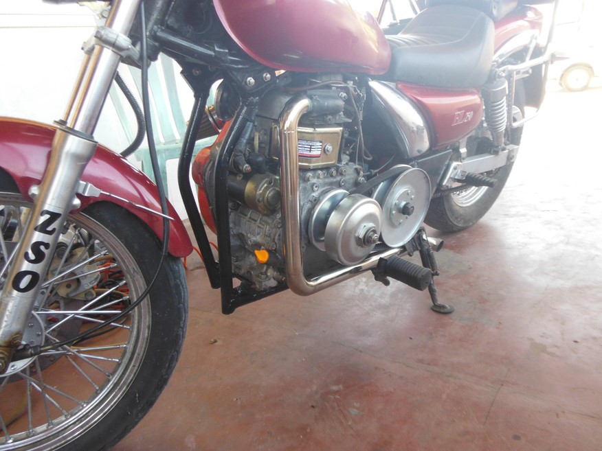 Only a protector for my food not get hurt on thec pulley is left to do. I drove 20 Km already runs fine. Top speed is 100 Km/h so far. But nobody goes this fast, because the speed limit is 60 on the high way, only the expessway is 100. I put the engine stop on the side stand with a cable, engine stops when it goes down. Ane I shold paint the engine cover in the same red as the bike.