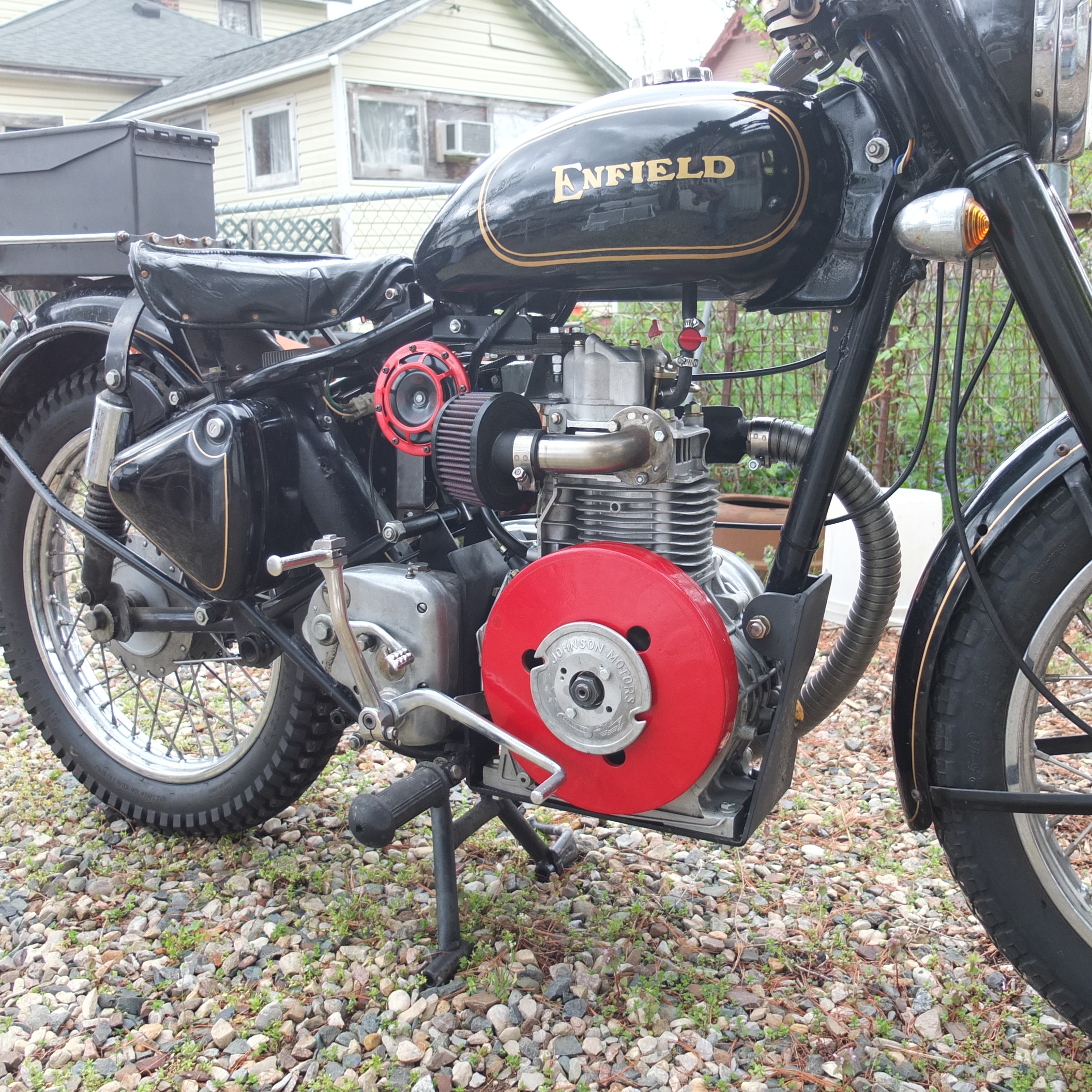 Great to see your completed bike. Looks GREAT!!! I did in fact get your call when you were in town the other week and tried both numbers I had for you in the hope that I could catch you while you were here to see both you and the bike, but no response from either number. I'd love to see it up close and personal. If you get back this direction, let's arrange to meet (you've got my number). Or, I'd be happy to come your direction as well. Perhaps on one of the Enfields. And I though of you just last weekend as I was trying to get a patient admitted to the Coldwater hospital (sadly, no open beds).