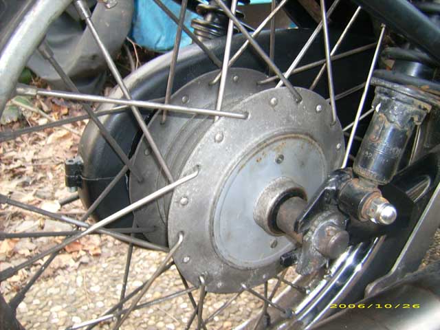 The exhaust has to come off for the rear wheel spindle to be removed, this revealed some new holes had appeared in the underside - I swear this silencer is now mostly brazeing rod. After a run over with some fresh engine enamel it's back in place again.