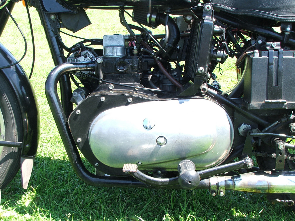 I can't find a jackshaft in that earlier post. In fact, it would appear in the pics below that Steve has the drive sprocket mounted to the flywheel and then uses the stock Enfield outer cover. The 4 speed is in it's original placement suggesting he's coming directly off the drive sprocket to the clutch. If so, you might think the engine would need to be offset a bit to the right, which might explain the battery counter balance to the left (well, of course there's also the reality that there's no other place to mount the battery). And yet, it you compare the downtube to the exhaust it seems to be nicely centered. We really need Steve to write up his build.