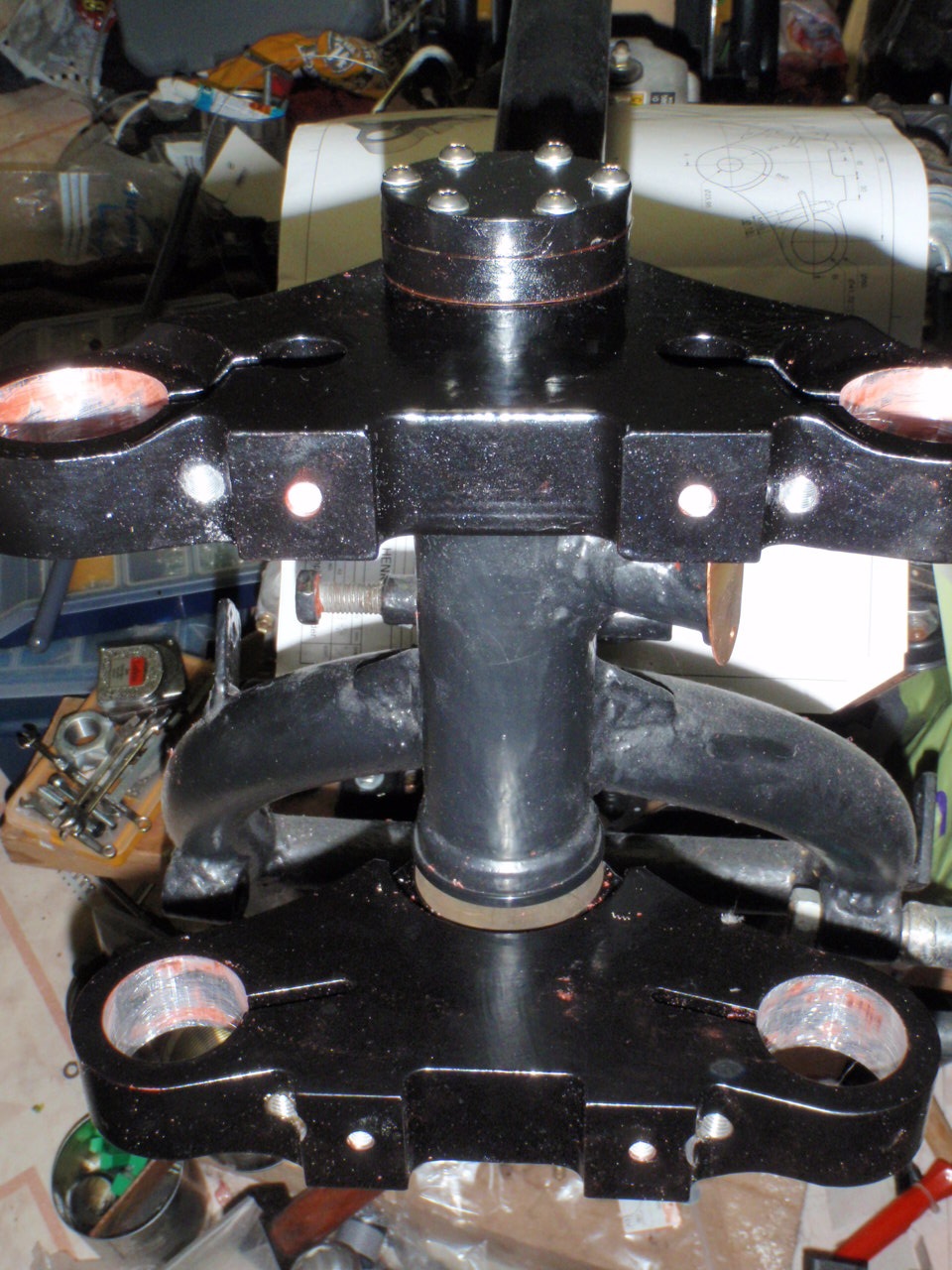 I use the fork of a BMW K100. It consists of 2 front legs each apart and connected in the crownplate.