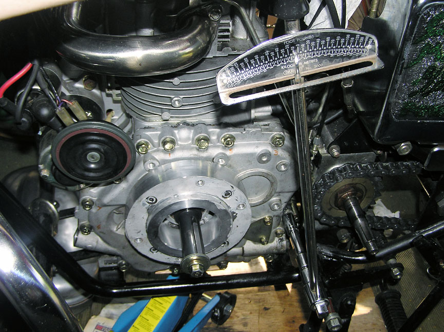 Now I could fit the primary chaincase cover, and tighten it very carefully to about 20lb-ft. That's around the tightness required to prevent oil leaks! They claim 12lb-ft, but it's not enough....