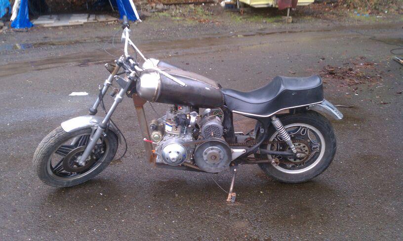 The Glupity Glup Gets Its Fuel Tank, My Turbo Diesel Hybrid Electric Motorcycle, 1982 Honda CM 450 Based. This is a 3 chamber fuel tank, the two side chambers are about 3 gallons each for diesel, and the center tank is about 2 gallons for the aquamist liquid intercooler water/alcahol ADI watler injection.... It has a 5hp permanent magnet motor, lipo4 2kwh battery, and exhaust waste heat recovery using peltier junction thermocouples.
