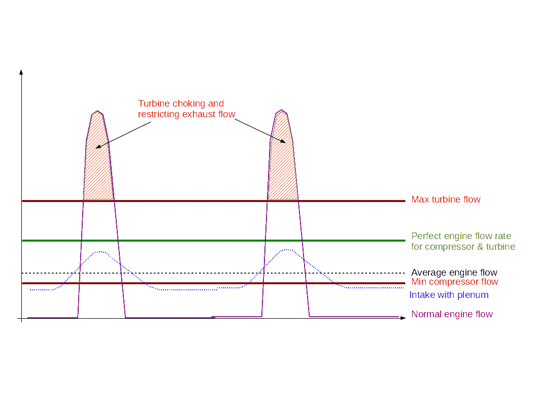Now turn to the exhaust. If the flow out the exhaust port were constant, then again we'd expect that the turbine was seeing just about enough flow to spin the compressor. But in practise we're seeing no flow for 540 degrees, and then 4 times the "average" flow for 180 degrees. Given that the exhaust valve doesn't open & close instantaneously, and the piston speed is sinusoidal, we might actually be seeing a peak of 6 times the average flow. This is probably too much for the turbine, so the turbine chokes and doesn't let the exhaust out.