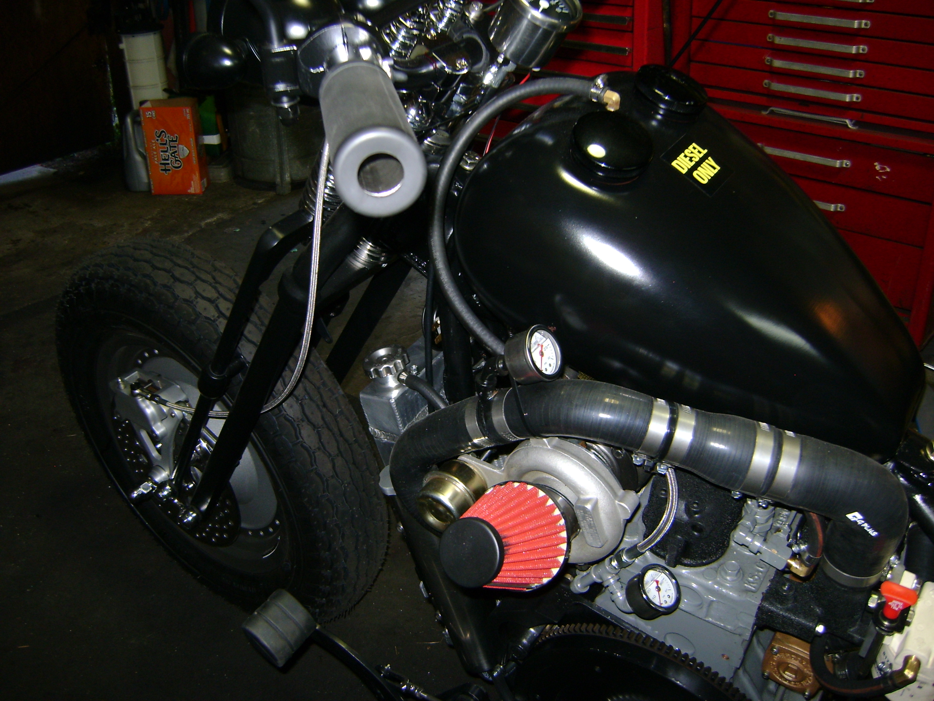 Thanks, I'll be sure to throw up a build thread, just have to get thru Xmas, then I'll have some time to put it up here. The transmission is a 4spd Harley trans, while I was building it was easier to make the shifter pedal a clutch pedal with linkage to a clutch release arm from the trans, and bolt on a custom made hand shifter handle, and yes the hose up to the tank is a fuel return line. The build was a fairly easy build, I didn't have to cut, or modify the frame, well not entirely true, I had to cut off the top engine mount tab on the frame to clear the valve cover, could be welded back on. I haven't ridden it yet, I was so close, I got a used clutch drum and engine pulley for the open belt drive, and I went cheap and got a "good used one" on flea- bay, totally worn out junk, so I bit the bullet and got a new set, just finishing up the install now, doing wiring right now too. These x mas holidays I hope to finish up the wiring and finish the belt drive and ride it. p.s. the turbo is a GT15 from flea- bay, can't wait to hear it spool up, under load.