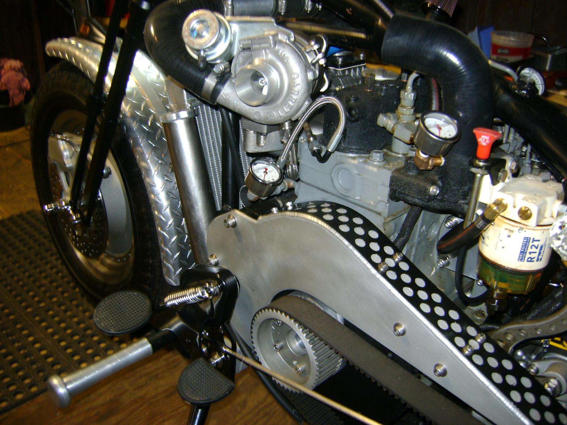 thanks for the invite and hospitality. I had a good all around trip, met lots of fantastic people, lots of good riding on incredible roads. rain and shine it was all great. I really put the little diesel through its paces. I really like the style and workmanship on your bike, your gonna have a lot of fun on it. your shop is awesome, and I would definetly come visit again. my injection system is still a work in progress and needs some refinements, but when it does work it works very well. I also need an efficient intercooler, more boost equals more heat and less power, very noticeable. I"ll try and get some pictures posted when I go through them all. good luck on the registration and shakedown of the bike. it was cool to have Canada's first unofficial dieselbike meet on the island, such a beautiful place. maybe we'll see some more in the future, you never know. keep in touch.