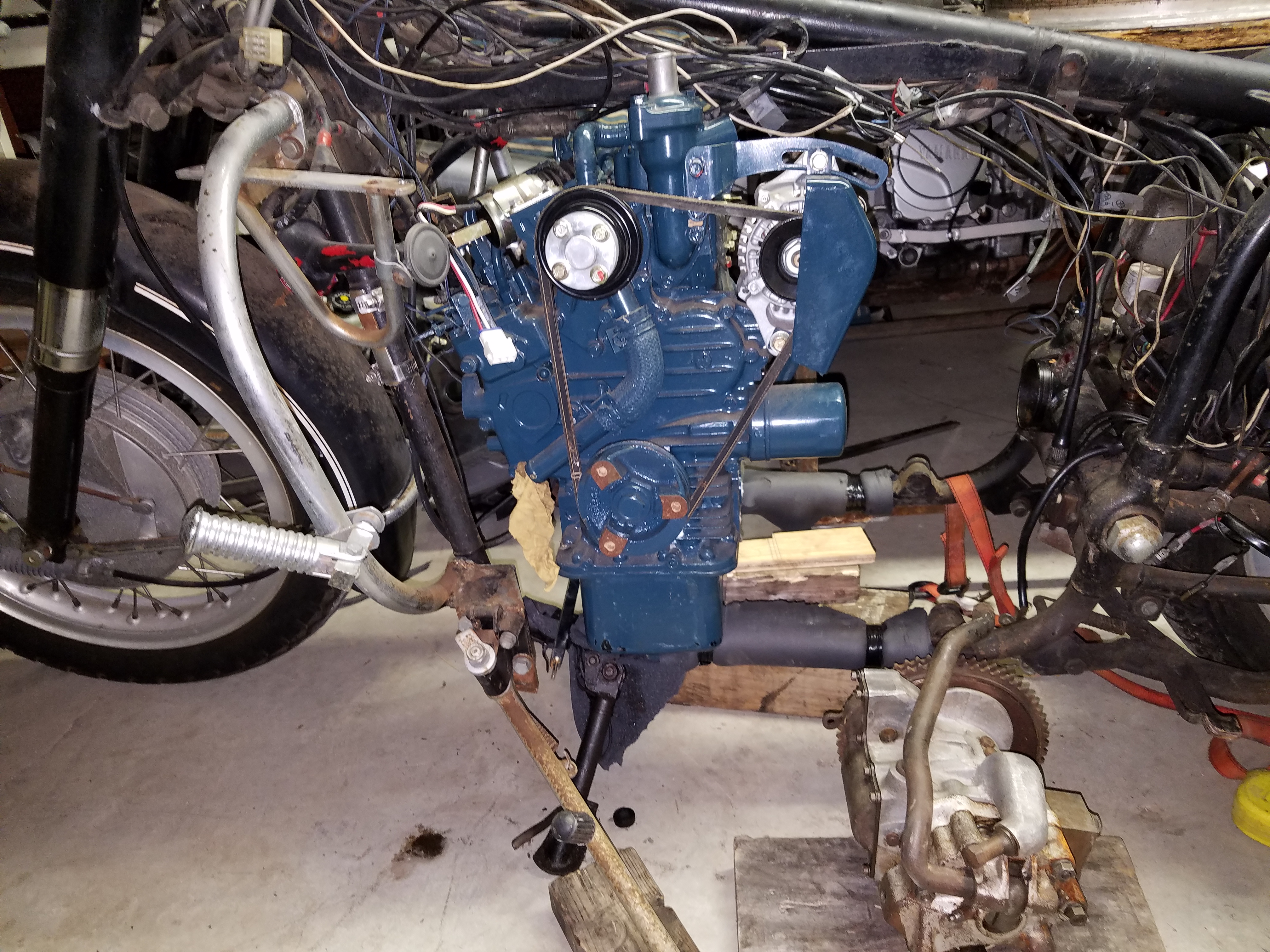 As an aside, the other benefit of choosing this engine is that when it comes time to mount your sidecar, your reverse can be driven by the hydraulic or power steering pump that bolts to the back of the injection pump cam. No doubt that's what Kubota had in mind when they designed it.