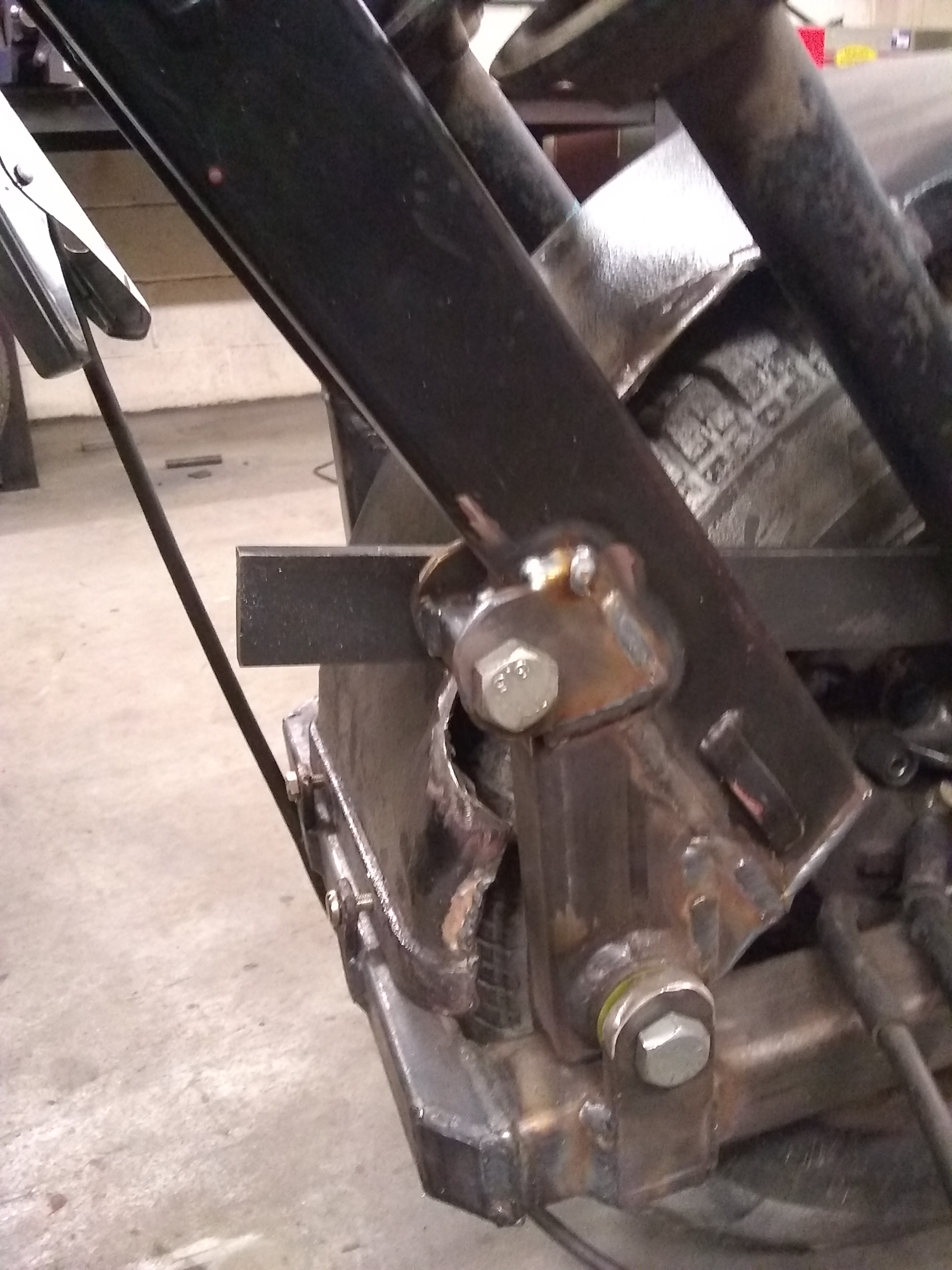 I have got the parts from the bloke at the engineering shop. Now its time to put it all together . Everything fits although I think I may be a little out on my measuring. I will get that sorted out after I have done the brakes and tested it out it is an easy fix. I have got a stay bar so it should make everything feel better when braking. I fitted another tyre as the sidewall was perished on the other but it is all good the suspension seems ok and I have got about 2 ½ inches of trail so it will hopefully be ok I was on about 3 inches before. I still have stuff to do but I am hoping to get everything sorted out by September. I need to get a few brake hoses I will make a bit for the tee connection and see how long they need to be.