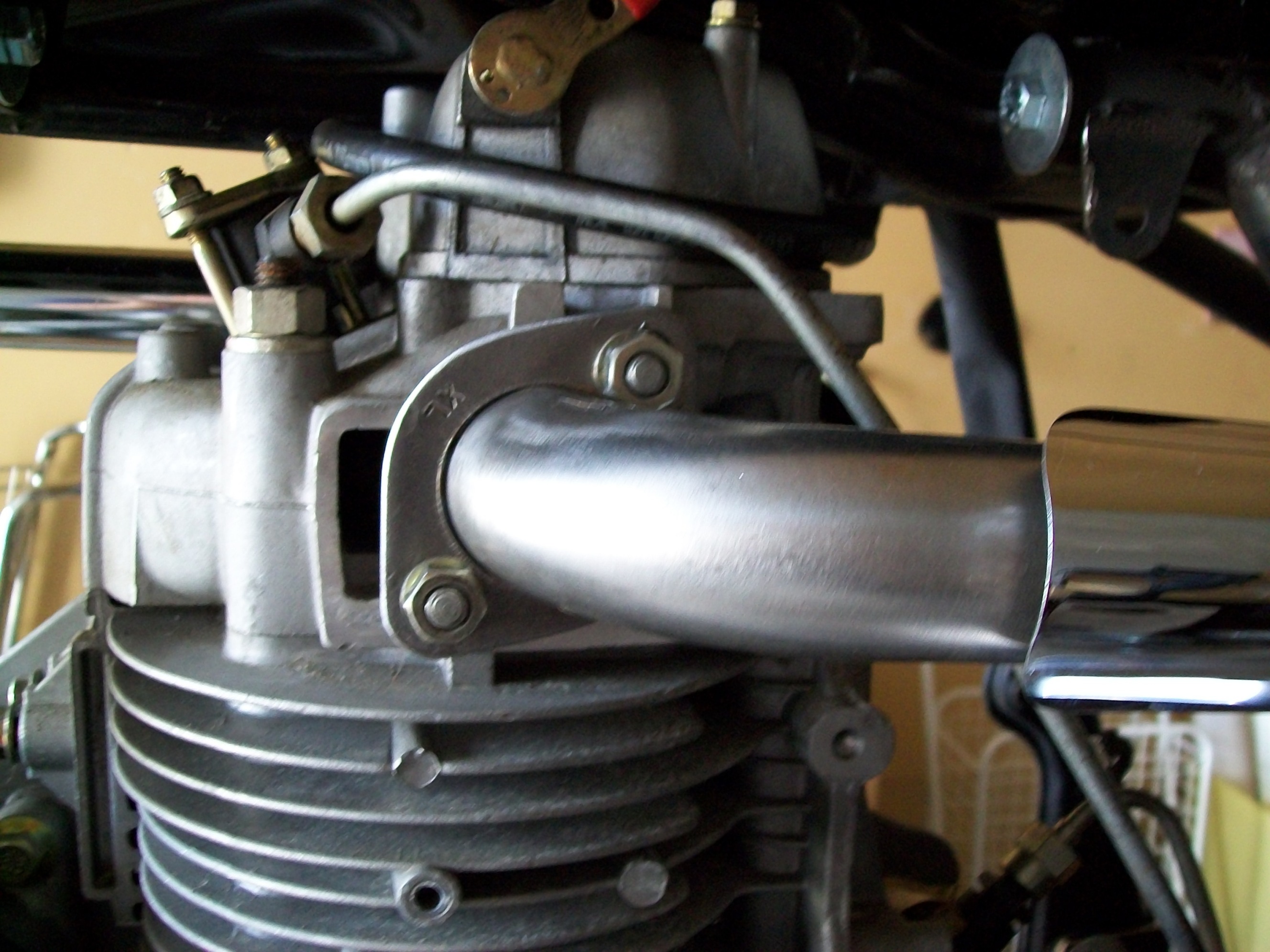 A few years ago I used a stainless steel bathroom grab bar to build my son a "custom" exhaust, as required by all 12 year old males for their John Deere lawn tractors. It worked great, and he has undoubtedly incurred permanent hearing loss as a result. It acquired a lovely brownish patina over time to to give it that "vintage" look. I found another grab bar at the ReStore for $5 from which I was able to cut 2 pipes with turn-out tips for the Yanclone. I had a flange lying around that only needed minor filing to fit. Incidentally, the exhaust flange for the Yanclone is the same as a stock older style VW air-cooled flange. So, total cost for the exhaust is thus $2.50, if you don't count that little chrome heat shield positioned so as to keep from torching the pants. I have plenty of stainless flat stock lying about with which to fabricate a rear hanger.