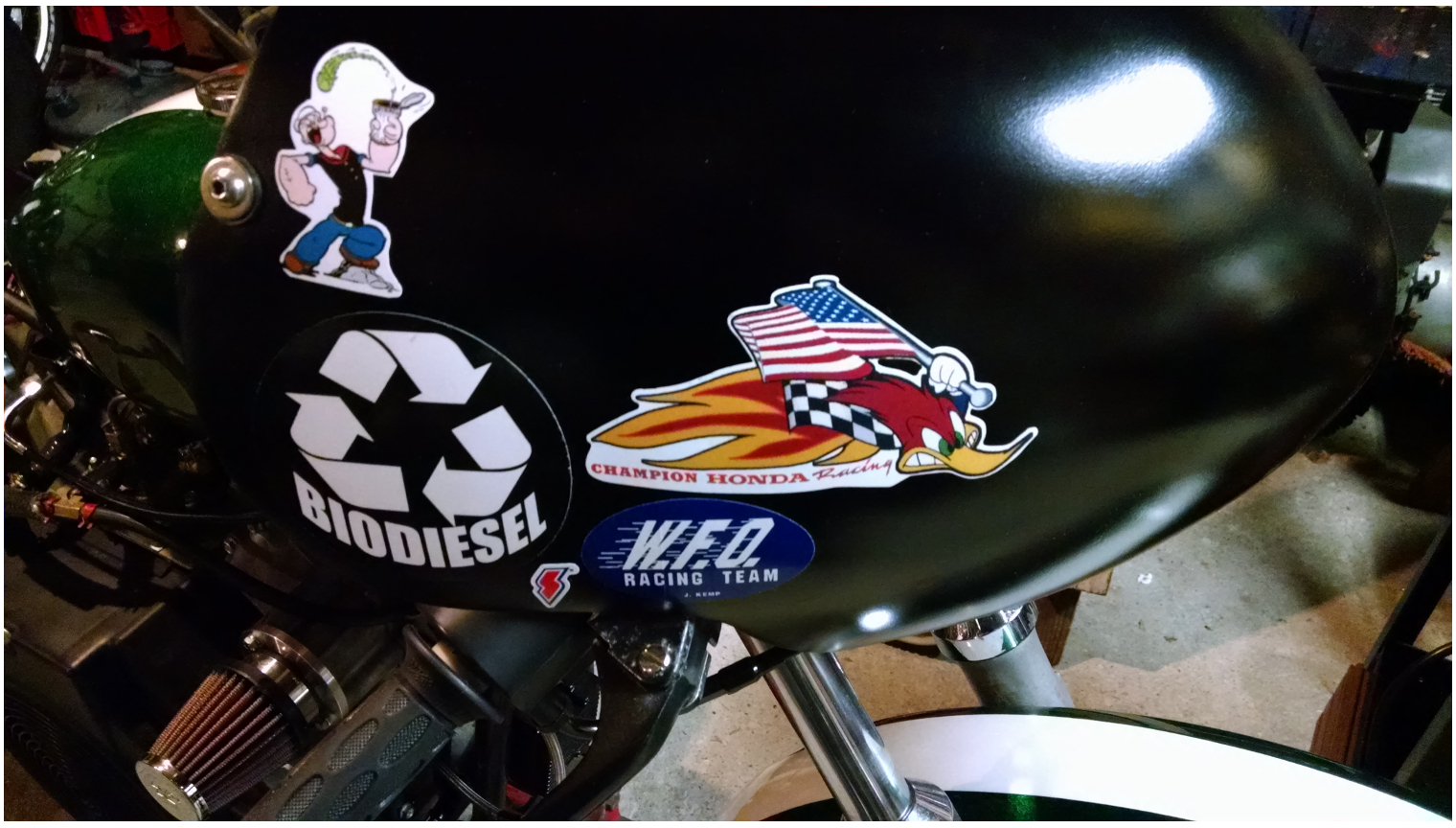 The donor was a heavily thrashed Suzuki dirtbike, and it was hilariously badly assembled by a high-school-age your truly, with zero build quality or safety features. Ultimately, the gas tank, foot pegs, nose cone, and some wiring were put into storage, and eventually recycled into the Biodiesel Sportster.