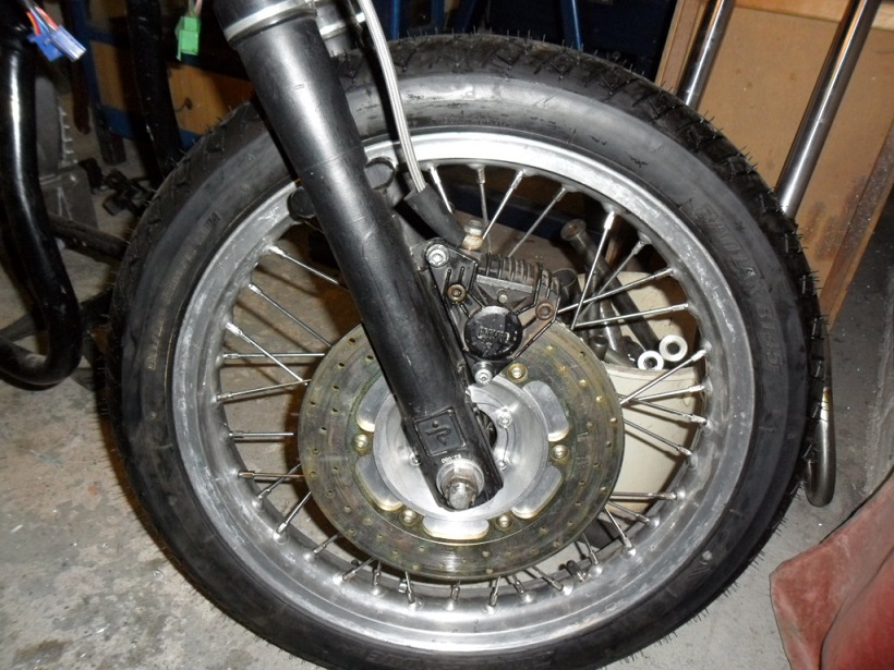 A kawasaki kz750 fork was fitted for it has an offset front axle. Yokes are still paoili, however Jeroen reworked the holes from 35 to 36 mm in diameter.