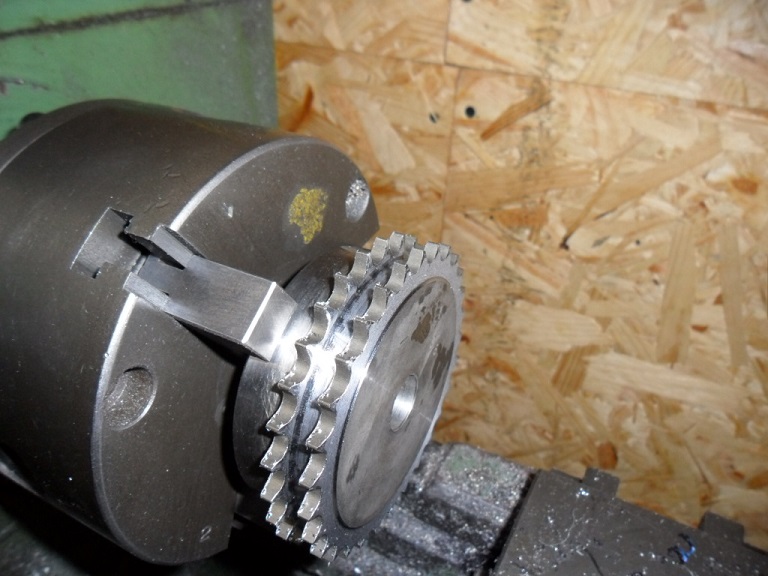 Here we see the primary chainwheel being reworked to fit on the diesel crank;