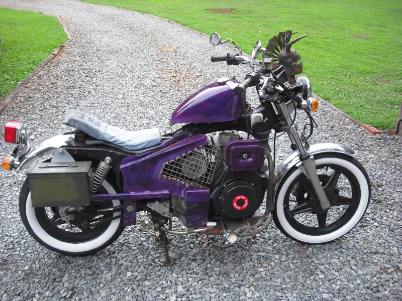 The plan is to make everything we can before cutting. We are enjoying riding season. We are actually turning the crankshaft from the kawasaki engine into a jackshaft to correct rotation. We are making a plate to seal where the cylinders where. The trans has five speeds. We know we will have to stretch the frame some. The plan is to take the lower back half of the kawasaki frame and mount the trans, then extend the lower frame forward and make mounts for the diesel. Once the engine/trans mounts are completed, we will take this subframe and mount it place of the current bolt out lower frame. After that we will cut/stretch to ensure clearances for everything else.We believe we really only need about 4 inches of stretch. Because of the way we plan on setting everything up, we can set the seat almost right on top of the trans. The bike weights around 450-500 pounds. If all goes we should lose some weight. We will only need one gaurd and it will be much smaller, so less metal. The five speed is 10 pounds lighter than the current drive box, so more weight loss. We are going to use the kawasaki clutch. There is a large heavy plate in the frame that we put in to hold the drive in alignment, we will not be needing it. Its going away.We hope to bring it closer to factory weight. When the trans work is done I'll post pics.I'm planning on documenting the rebuild as well.
