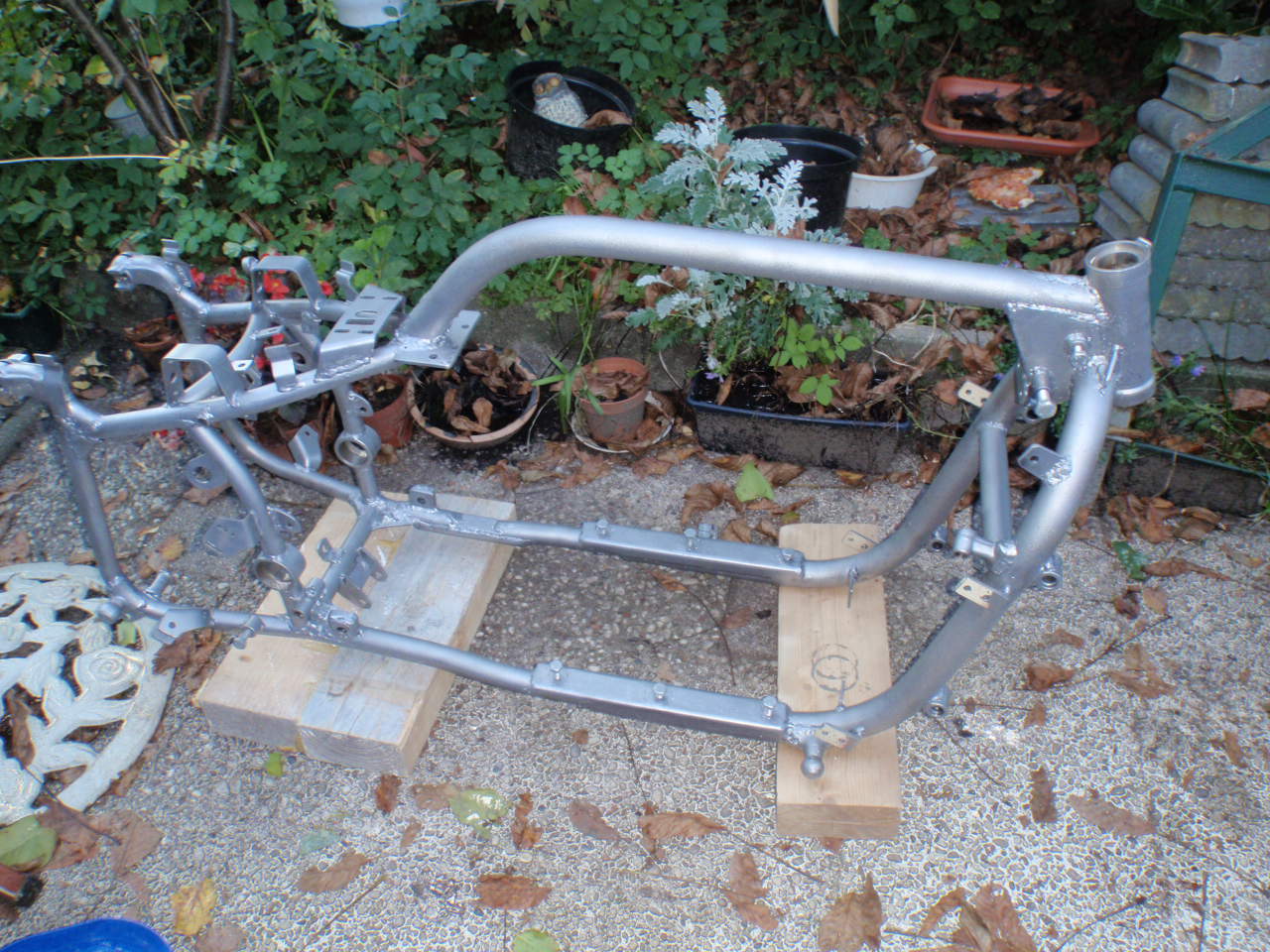 I used the rear end of a Dneprframe and the rest I made of pipes to become a frame for fitting the big engine and gearbox.