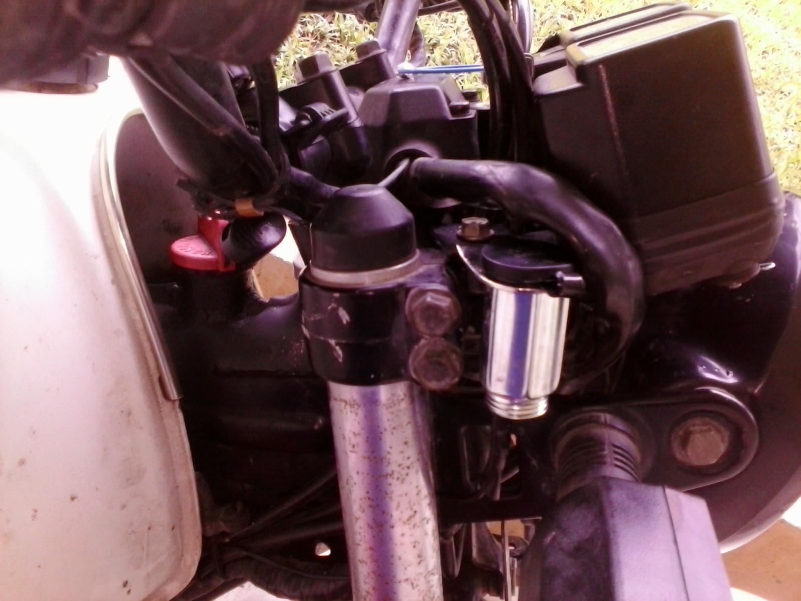 Added a 12v power plug. Bike is 6v. Will be used for Cellphone/GPS power. 12v plugs for this drop things to 5v 1amp so this should be fine w/6v source instead of 12v. Filled underside of socket with silicon. Hopefully keeps water out..... and NOT holds water in lol.