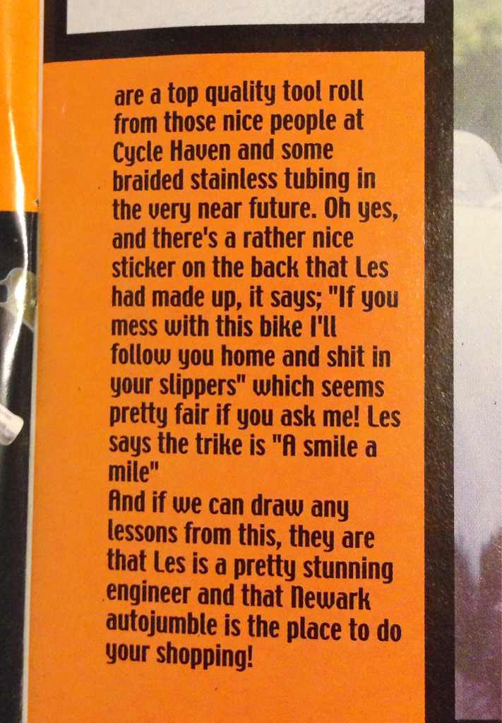 This trike was featured in 100% biker mag..
