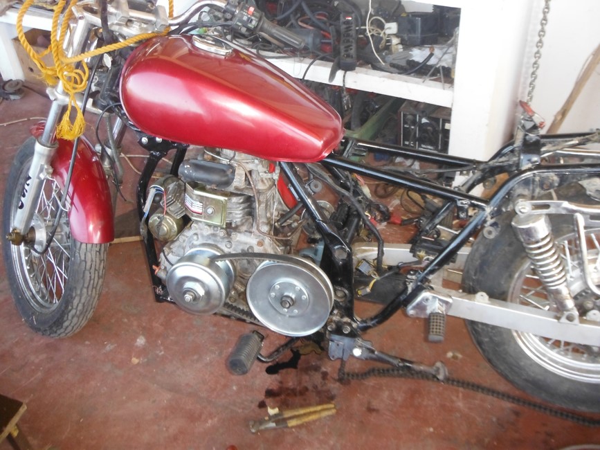 Only a protector for my food not get hurt on thec pulley is left to do. I drove 20 Km already runs fine. Top speed is 100 Km/h so far. But nobody goes this fast, because the speed limit is 60 on the high way, only the expessway is 100. I put the engine stop on the side stand with a cable, engine stops when it goes down. Ane I shold paint the engine cover in the same red as the bike.