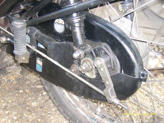 The exhaust has to come off for the rear wheel spindle to be removed, this revealed some new holes had appeared in the underside - I swear this silencer is now mostly brazeing rod. After a run over with some fresh engine enamel it's back in place again.